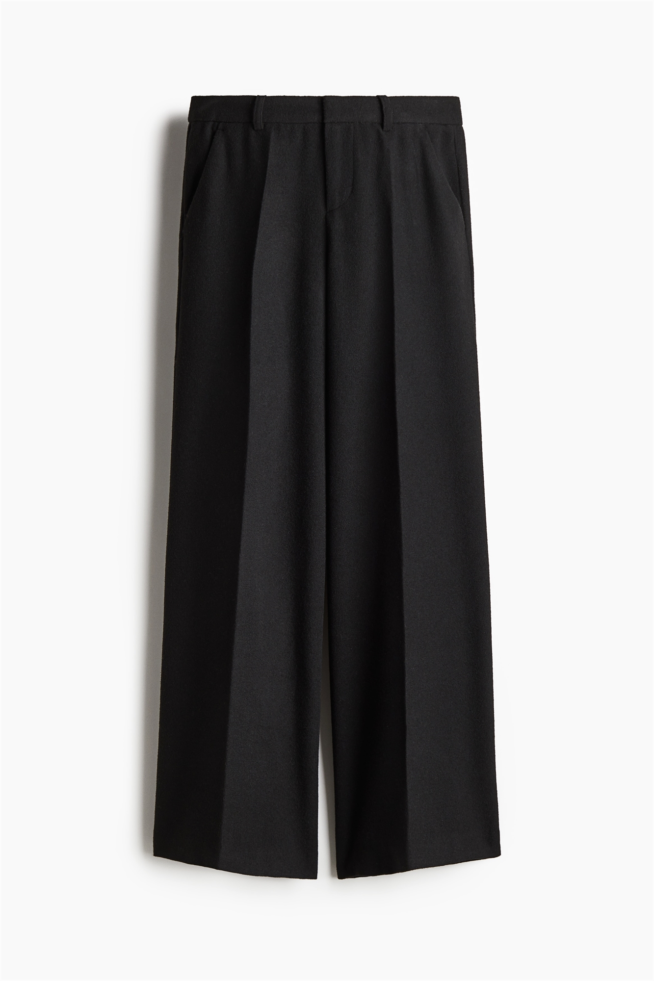 Брюки из тканого материала с матовой отделкой. Заниженная талия, ширинка на молнии с потайной застежкой на пуговицу и крючок, диагональные боковые карманы и фальшивые карманы сзади. Широкие ноги со складками спереди.