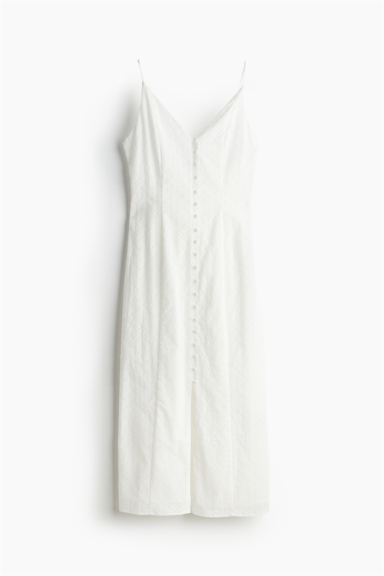 Приталенное платье длиной до колена из хлопкового полотна с отделкой бродери-англиз. Бретели-спагетти, продетые через маленькие петли и завязывающиеся сзади. V-образный вырез, застежка на пуговицы спереди и потайная молния с одной стороны. Формообразующие швы спереди и сзади для придания силуэту стройности. Подкладка из хлопкового вуаля.