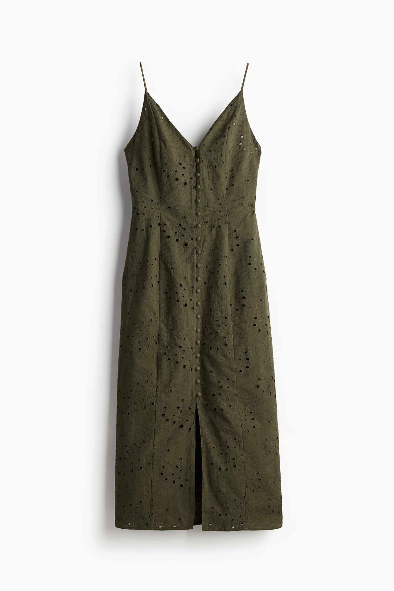 Приталенное платье длиной до колена из хлопкового полотна с отделкой бродери-англиз. Бретели-спагетти, продетые через маленькие петли и завязывающиеся сзади. V-образный вырез, застежка на пуговицы спереди и потайная молния с одной стороны. Формообразующие швы спереди и сзади для придания силуэту стройности. Подкладка из хлопкового вуаля.