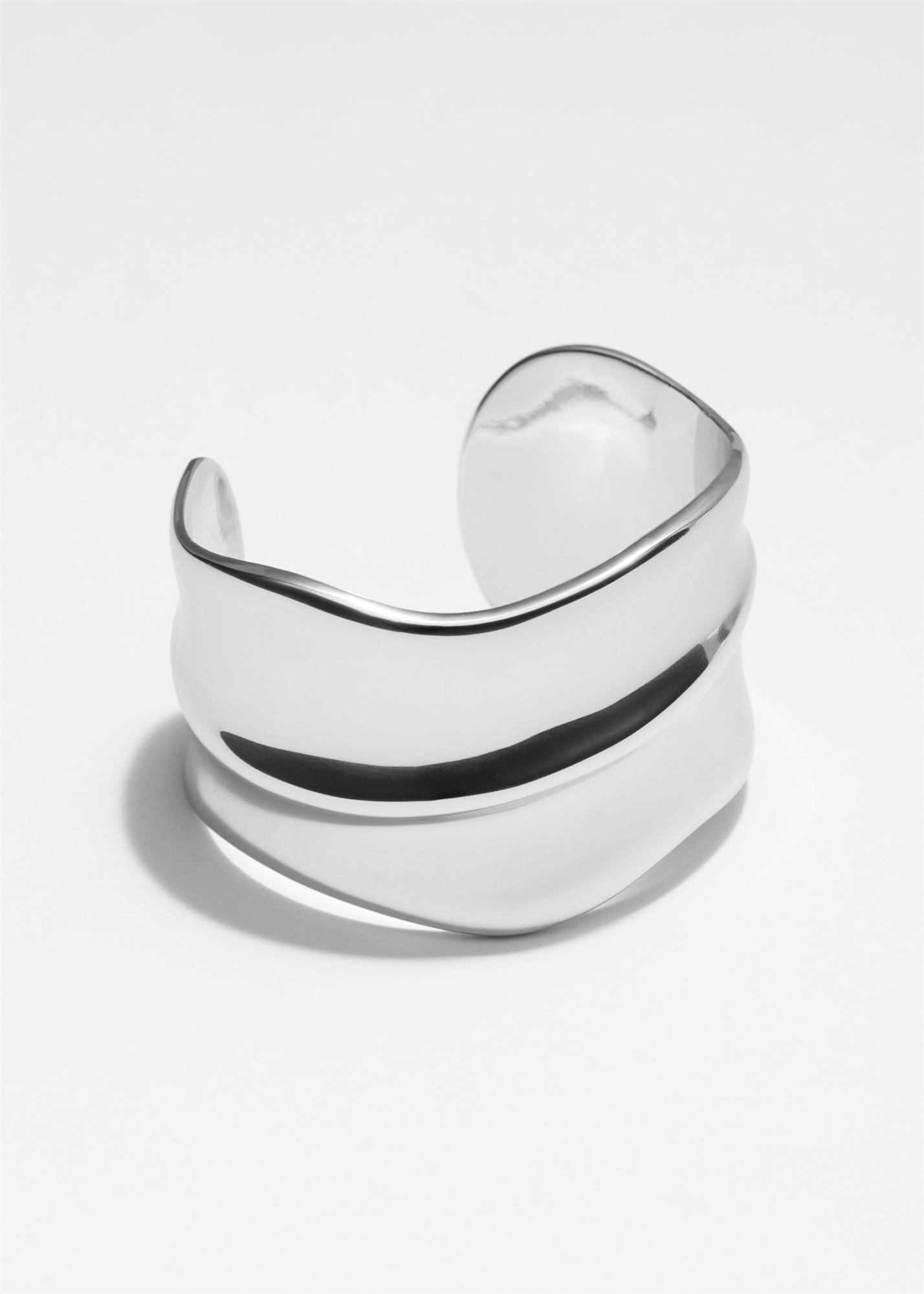 Этот браслет-манжета изготовлен из полированной латуни золотистого тона и имеет скульптурную волнистую форму, красиво обрамляющую запястье.