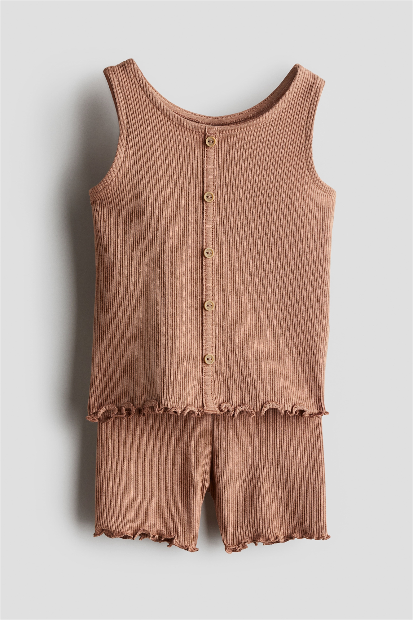Комплект из топа без рукавов и велошорт из ребристого хлопкового джерси с деталями из оверлока. Топ с круглым вырезом и декоративными пуговицами спереди. Шорты с регулируемой эластичной талией.