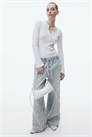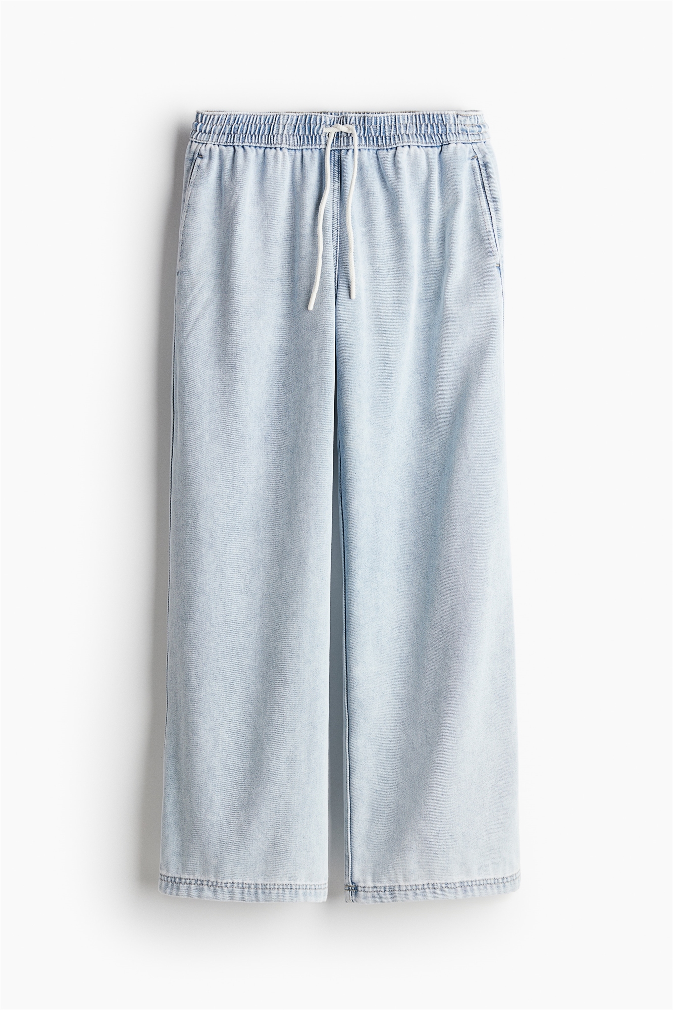 Брюки из прочного денима с эластичным поясом и утягивающим шнурком. Небрежные боковые карманы, один открытый задний карман и прямые ноги. Свободный крой.