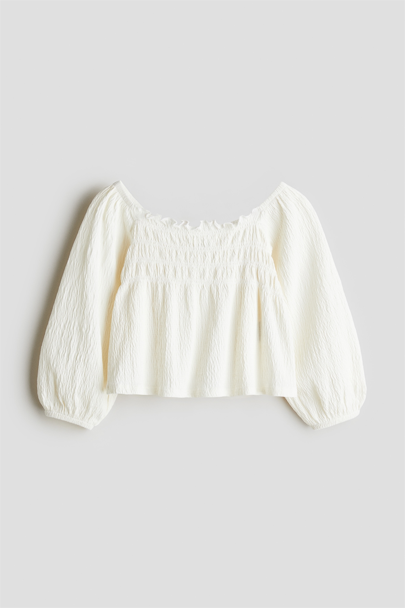 Расклешенная блузка из мягкого мятого трикотажа. Квадратный вырез горловины с втачным разрезом. Длинные пышные рукава с узкими эластичными манжетами.