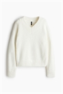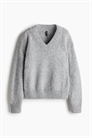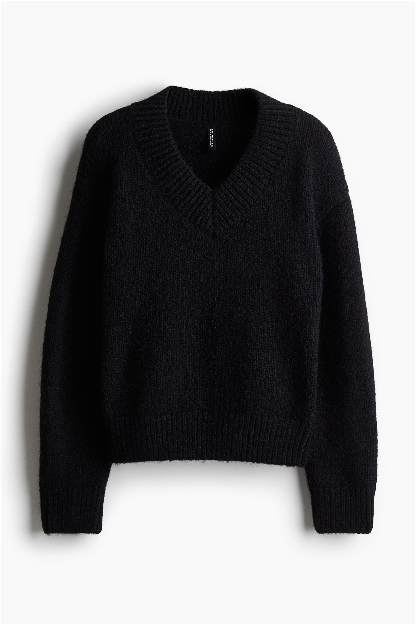 Джемпер свободного кроя из мягкого трикотажа с ребристым V-образным вырезом, спущенными плечами и длинными рукавами. Ребра на манжетах и подоле.