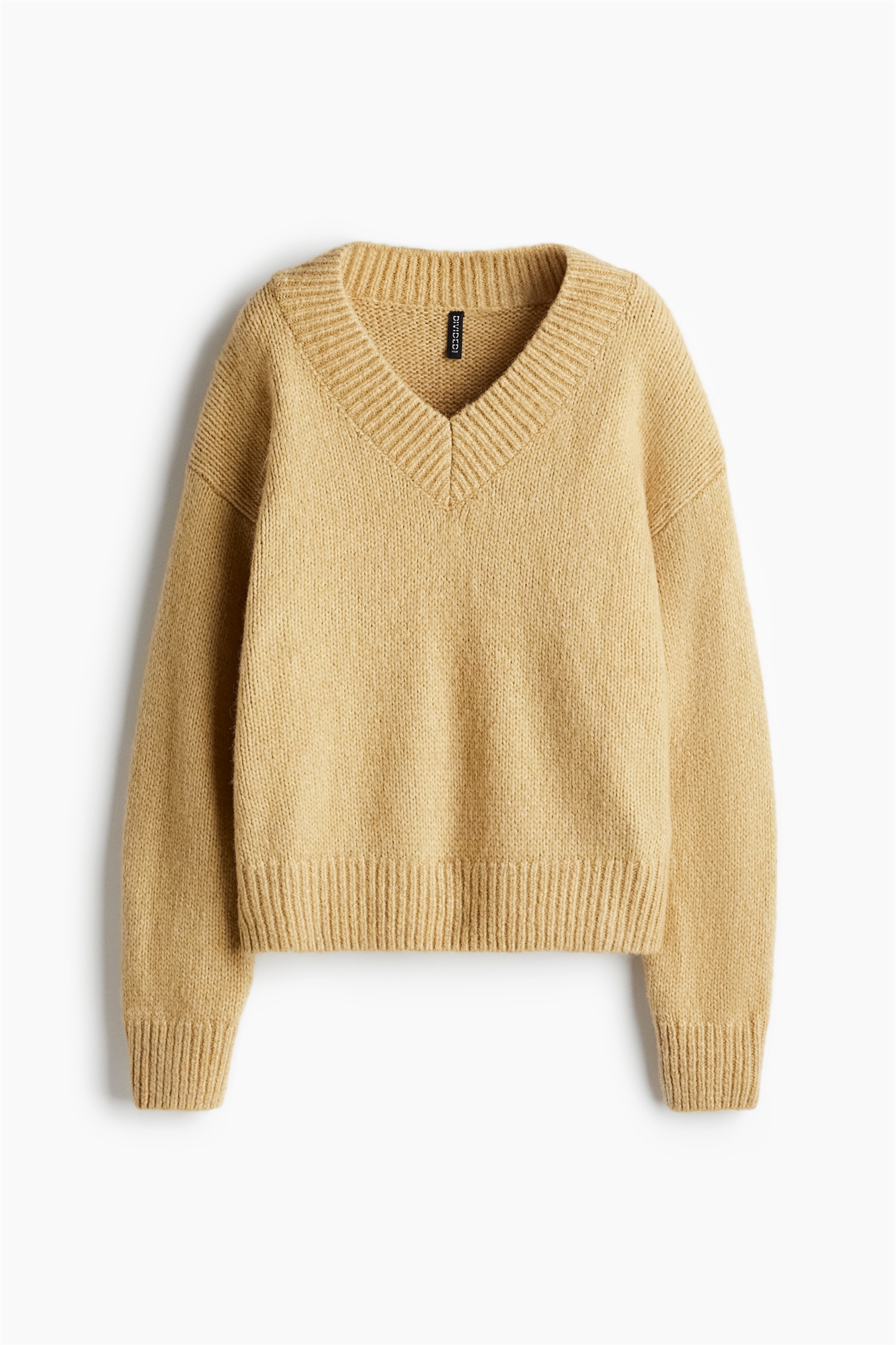 Джемпер свободного кроя из мягкого трикотажа с ребристым V-образным вырезом, спущенными плечами и длинными рукавами. Ребра на манжетах и подоле.