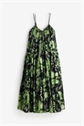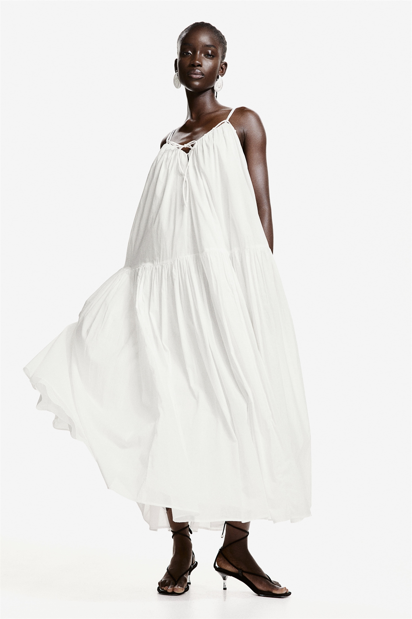 Длинное платье свободного кроя из мягкого хлопкового полотна. Его дизайн включает в себя воздушный А-линейный силуэт со складками в верхней части. Двойные регулируемые бретели-спагетти, одна из которых продевается через маленькие петельки вдоль каждой стороны глубокого V-образного выреза платья, а затем застегивается на бант спереди. Ярусная сборка ниже бедер для придания объема. На подкладке.