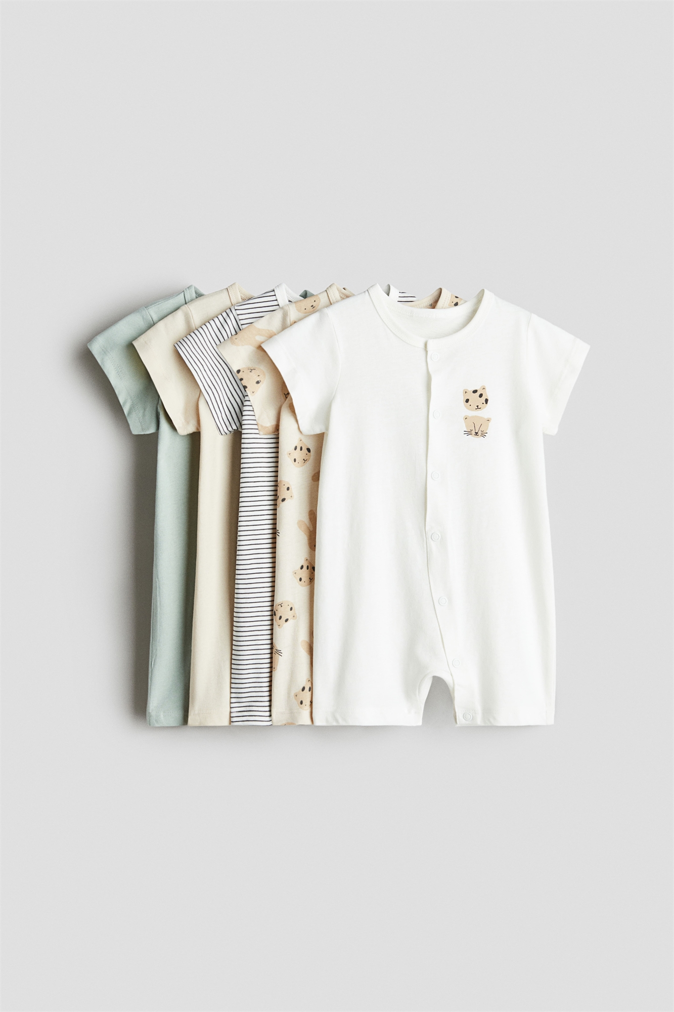 Спальные костюмы с короткими рукавами из мягкого хлопкового джерси. Застежки спереди и вдоль одной ножки для удобства переодевания. Короткие ножки.