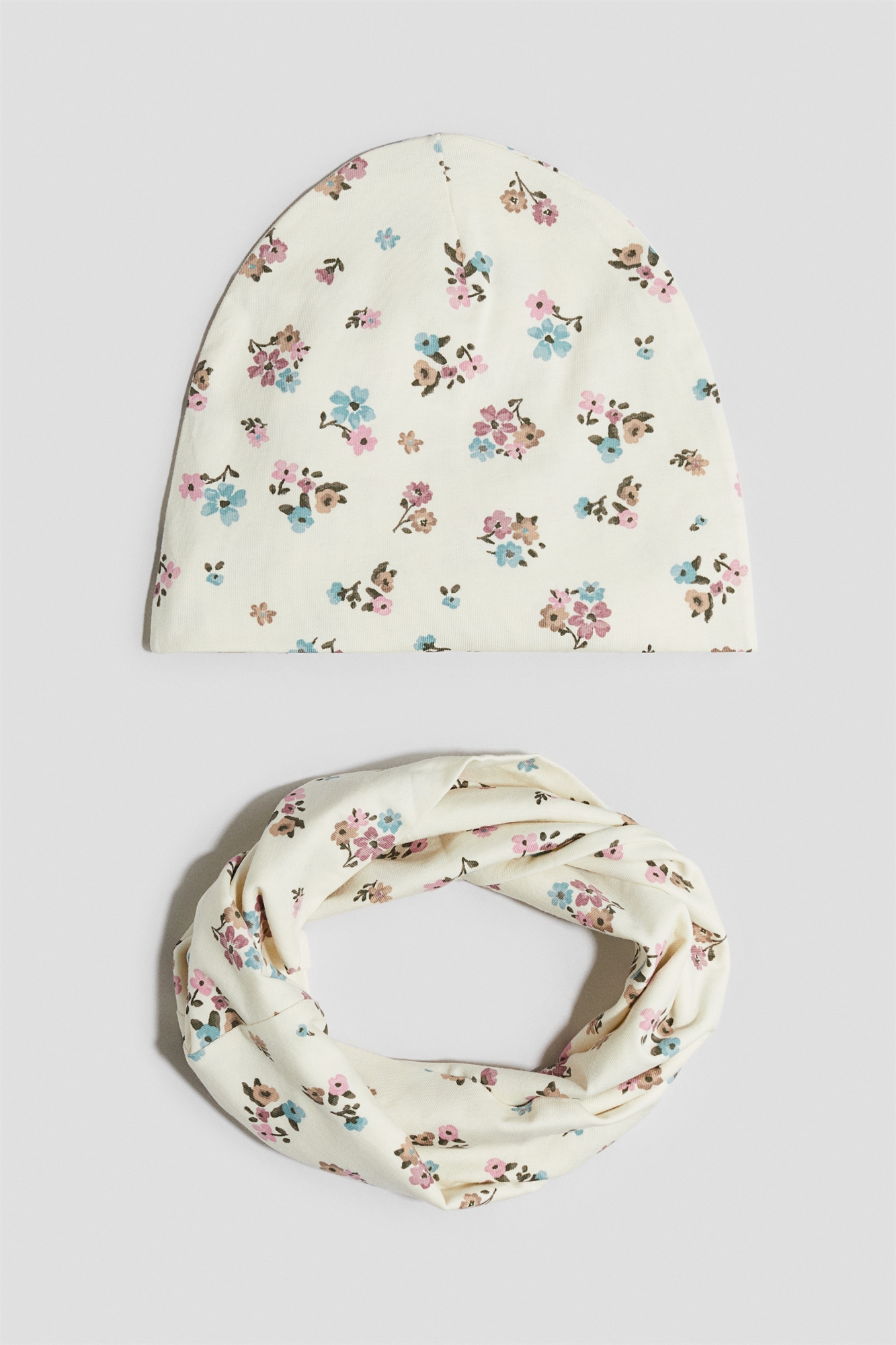 Шапка и шарф-труба из мягкого двухслойного трикотажа с принтом на всю длину.