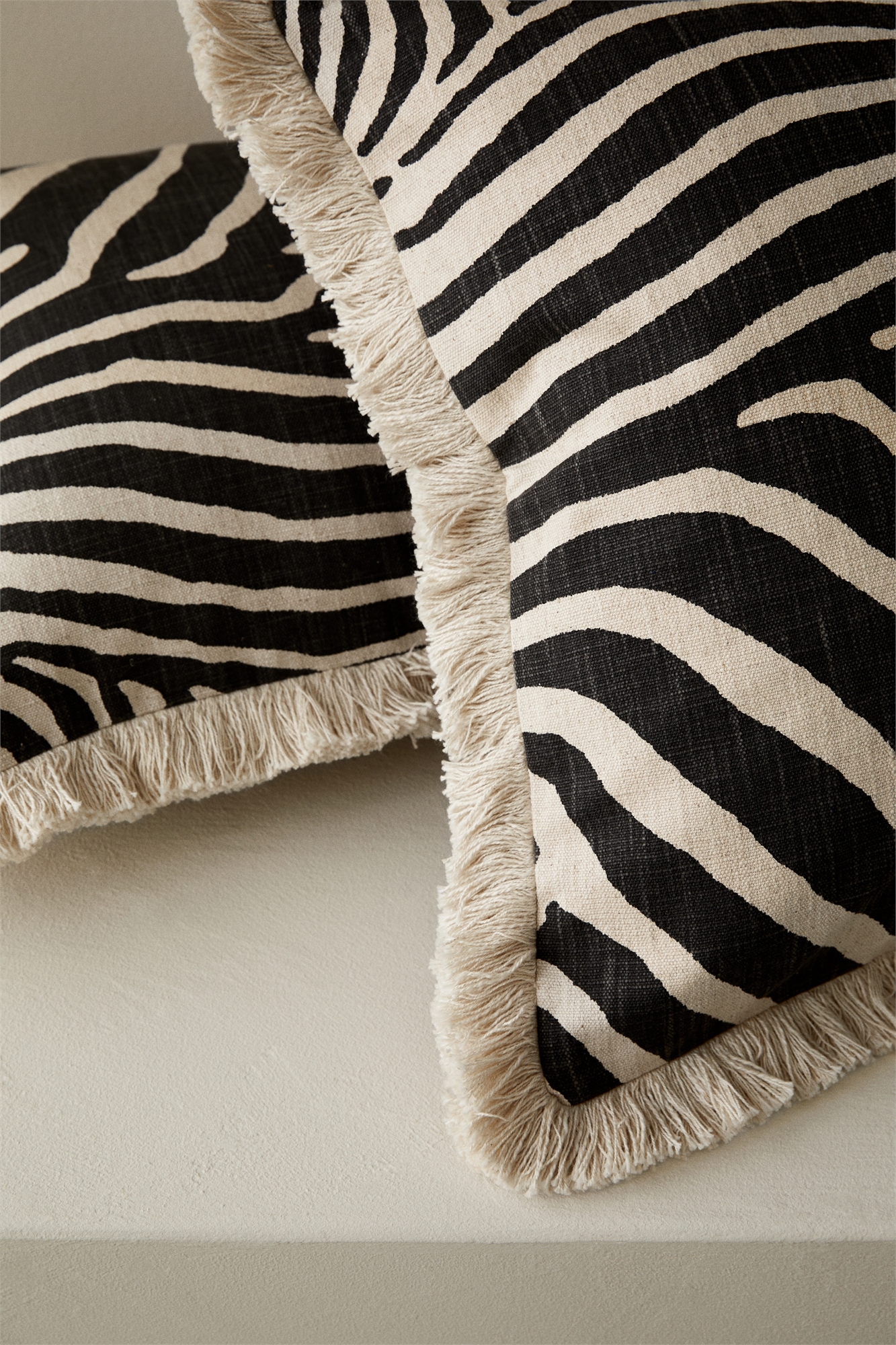 Чехол для подушки из смеси хлопка и льна с узором по всей поверхности, бахромой по всем четырем сторонам и потайной молнией на спинке.