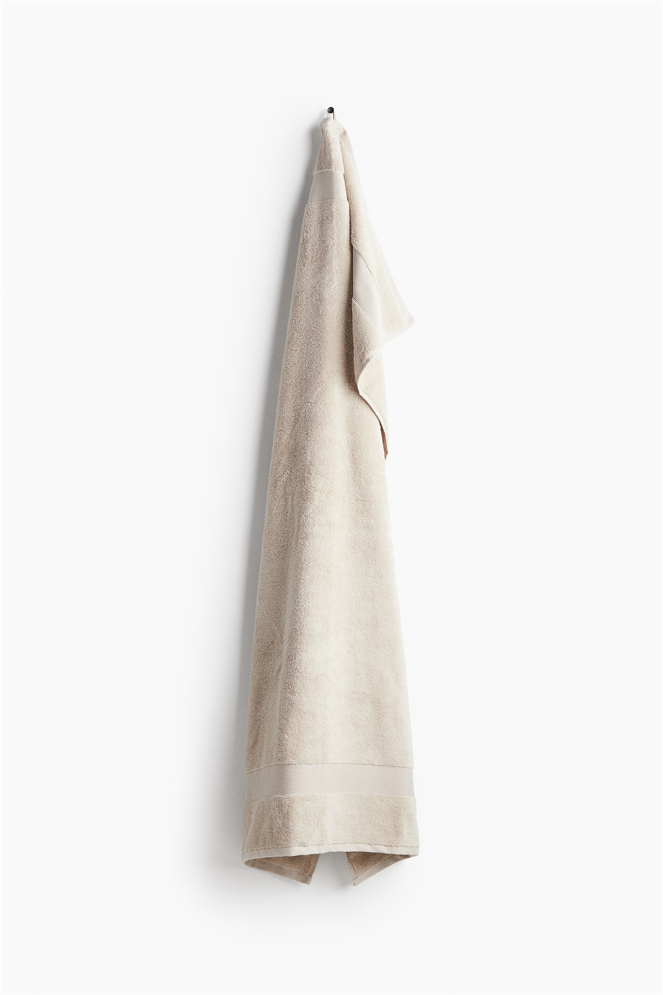 Большое полотенце из мягкой и пушистой хлопковой махры с высокой степенью впитываемости. Полотенце имеет тканые секции на коротких сторонах, которые можно легко смешивать и сочетать для создания индивидуального стиля дома. Петля для вешалки на коротких сторонах. Вес: 520 GSM. В серию входят полотенца нескольких размеров.