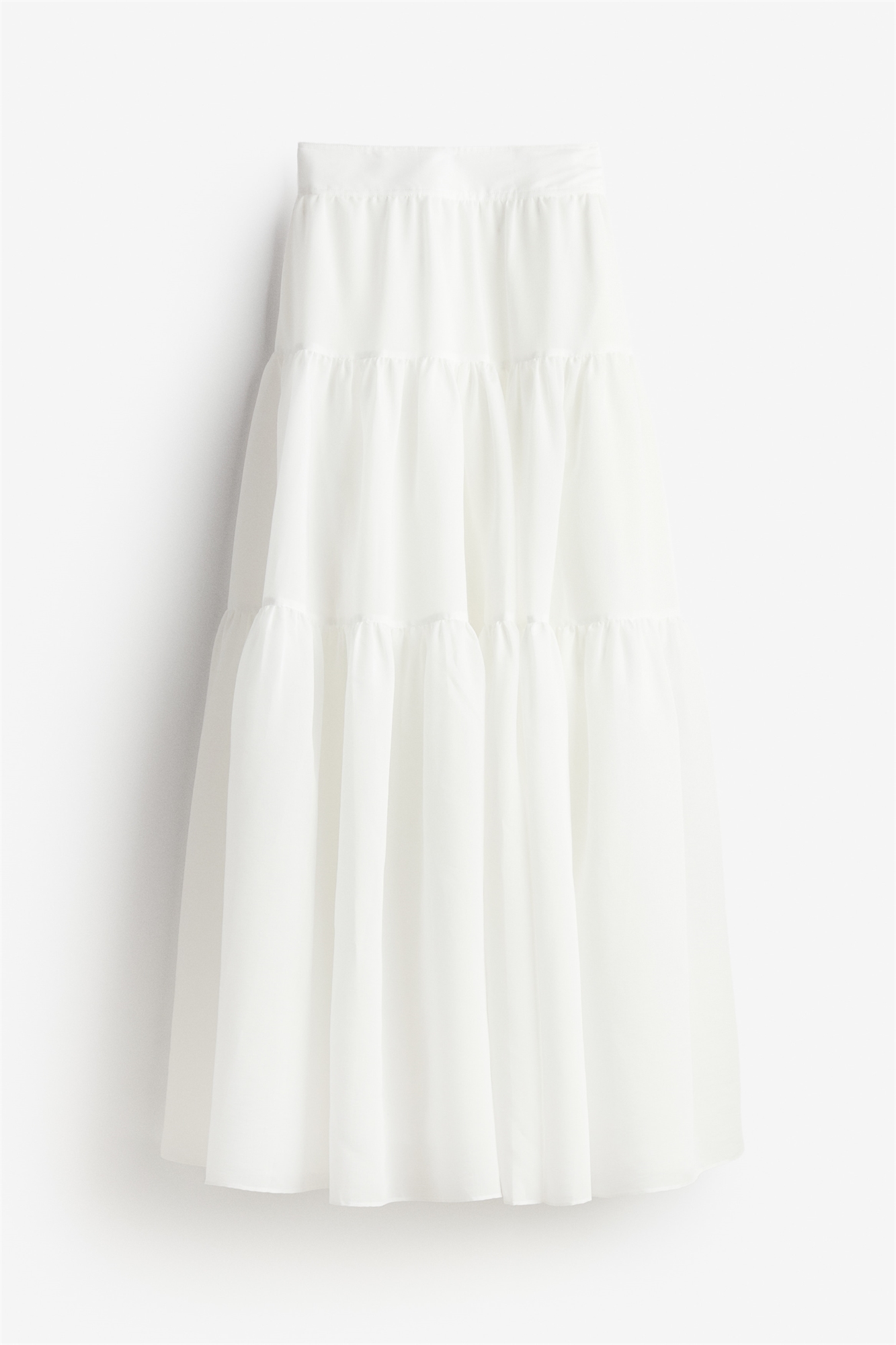Длинная расклешенная юбка с мягким плетением из смеси лиоцелла. Свободный крой с собранными ярусами для придания объема и высокая талия с потайной застежкой на молнию и крючок с ушком с одной стороны. Подкладка из хлопкового вуаля.