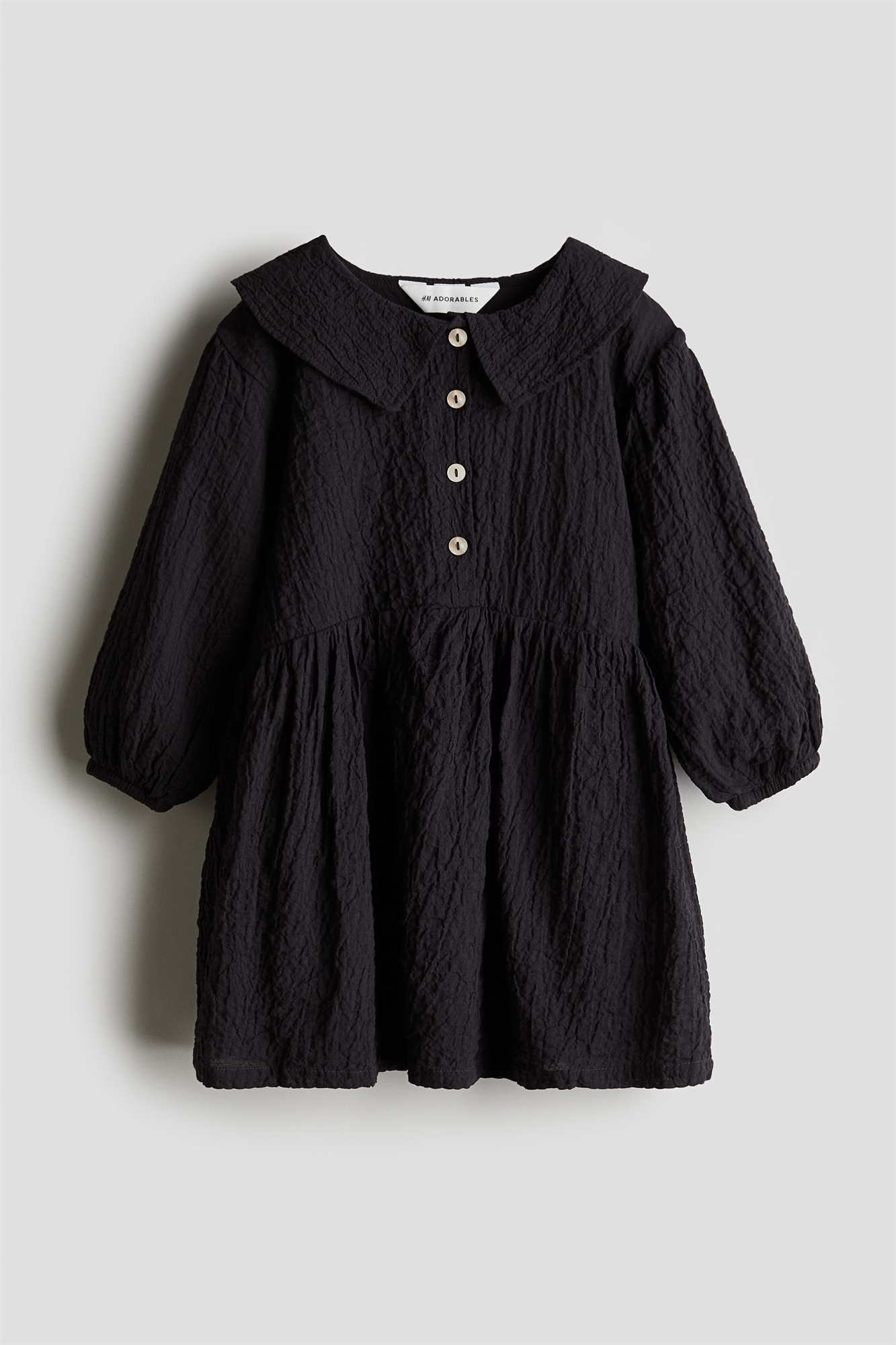 H&M Adorables. Платье из воздушного ситцевого полотна из высококачественного хлопка. Круглый вырез, матросский воротник и пуговицы в верхней части. Спущенные плечи и длинные пышные рукава с узкими эластичными манжетами. Сборки на талии и расклешенная юбка. Хлопковая подкладка. Коллекция H&M Adorables - это подборка удобных и качественных вещей, которые не подвластны времени.