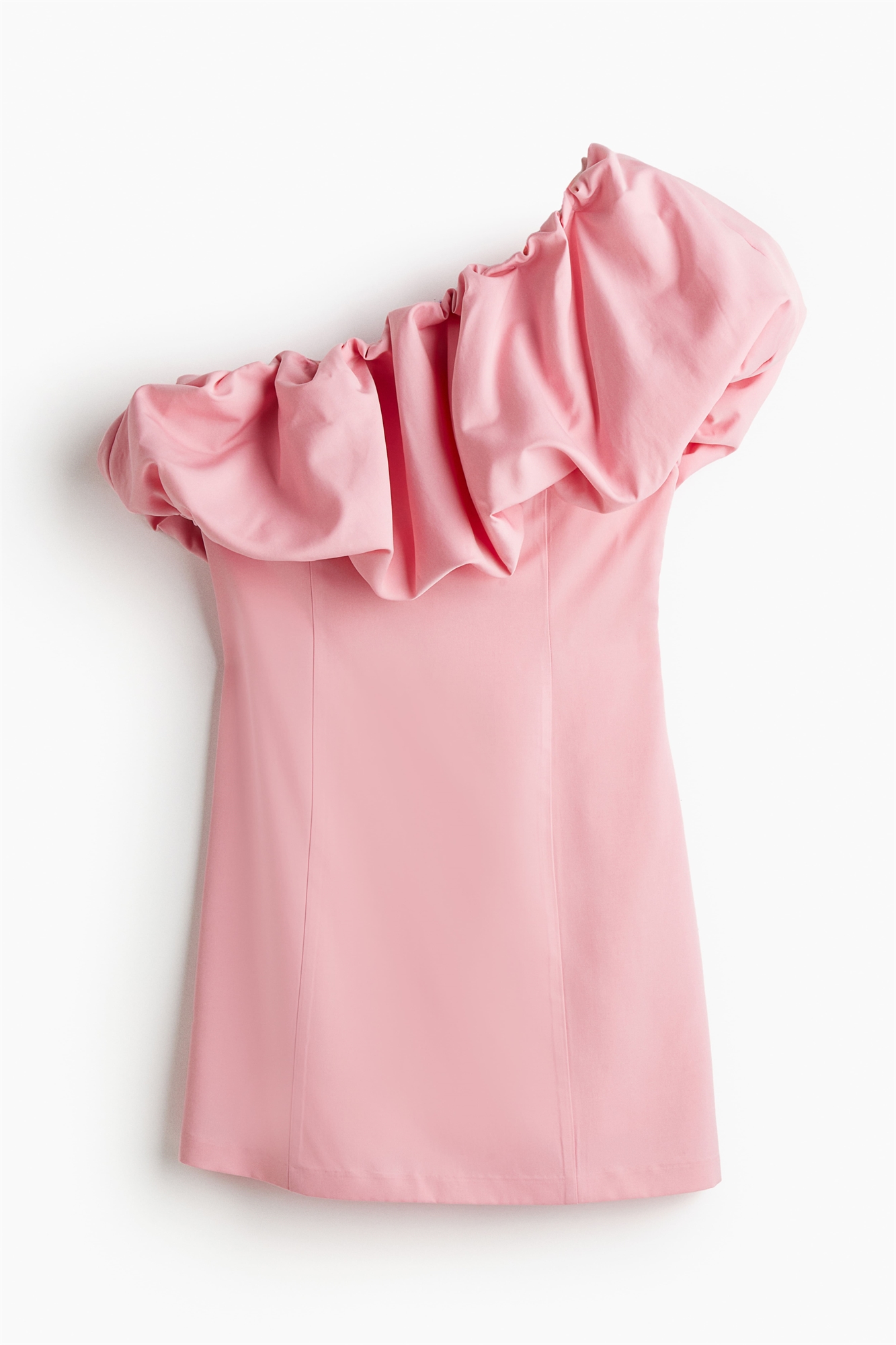 Короткое приталенное платье из тканого материала с асимметричным вырезом и пышным воланом вокруг верха и на одном плече. Скрытая застежка-молния и застежка-крючок с одной стороны, формирующие швы спереди и сзади для придания силуэту облегающего вида. На подкладке.