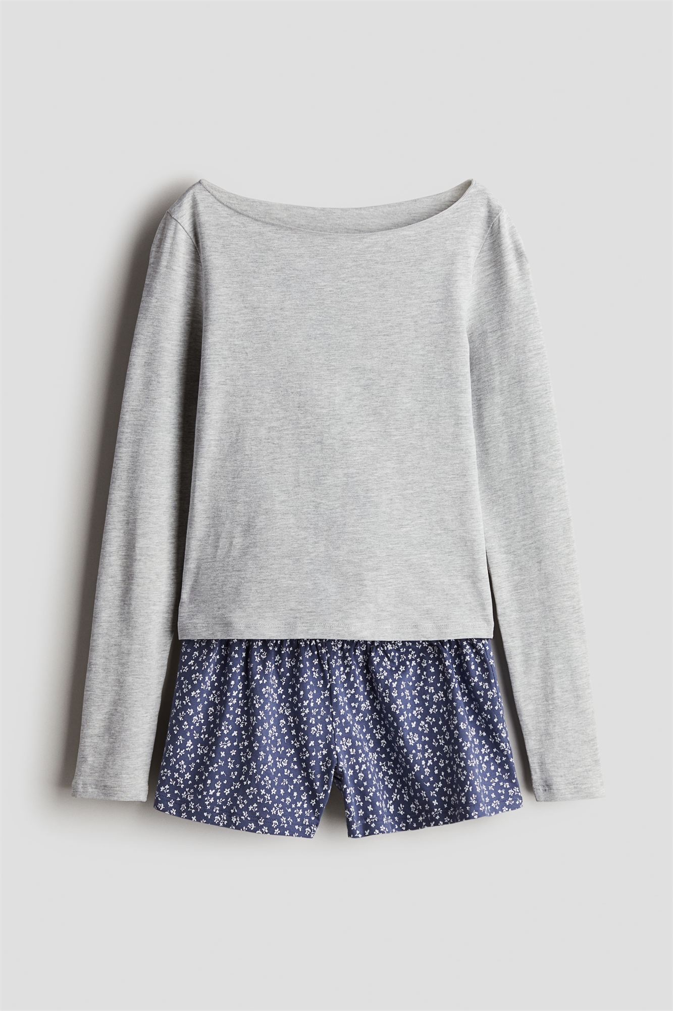 Пижама с топом и шортами из мягкого хлопкового джерси. Топ с необработанным краем, вырезом-лодочкой и длинными рукавами. Шорты с эластичной талией.