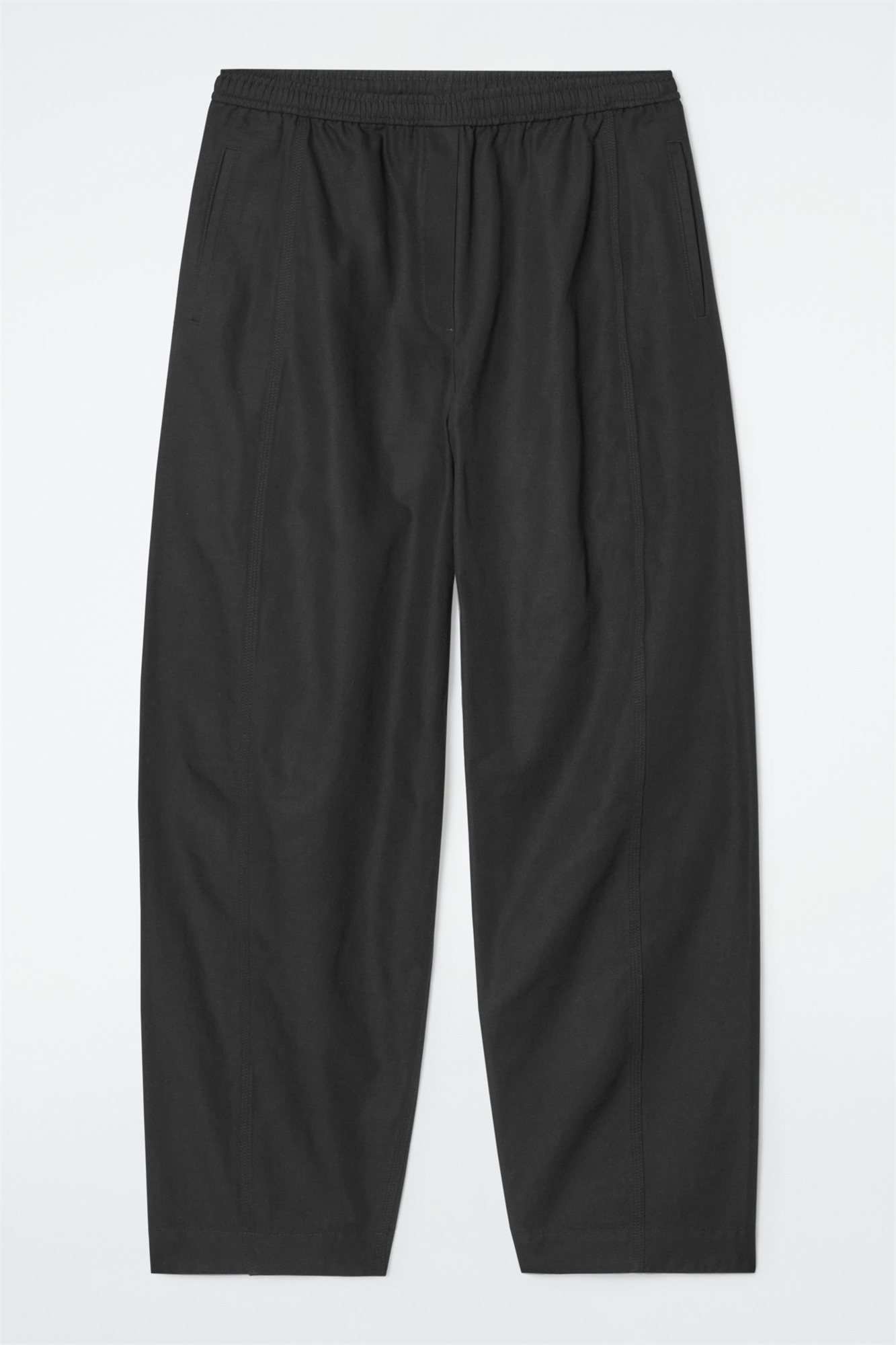Эти современные брюки простого черного цвета имеют скульптурную бочкообразную форму штанины, которая дополнительно подчеркивается складками у колена. Модель из хлопка также имеет завязки на внутренней стороне и незаметные карманы в боковых швах. Регулярный крой Внешний материал и подкладка: 100% хлопок. Детали исключены/Машинная стирка Внутренняя длина штанины в размере 36 = 69,8 см/Модель носит размер 36