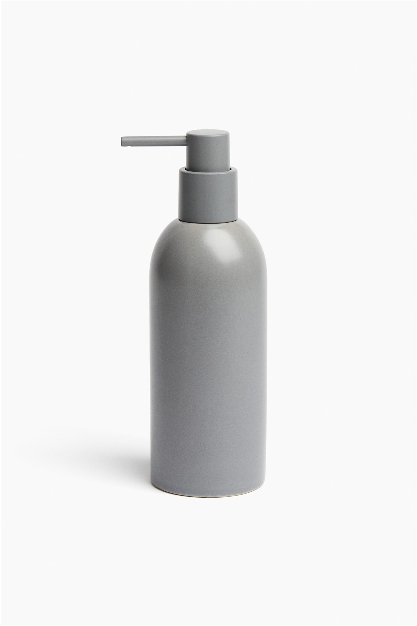Дозатор для мыла из глазурованного керамогранита с пластиковым насосом. Диаметр 6,5 см. Высота без учета насоса 15 см.