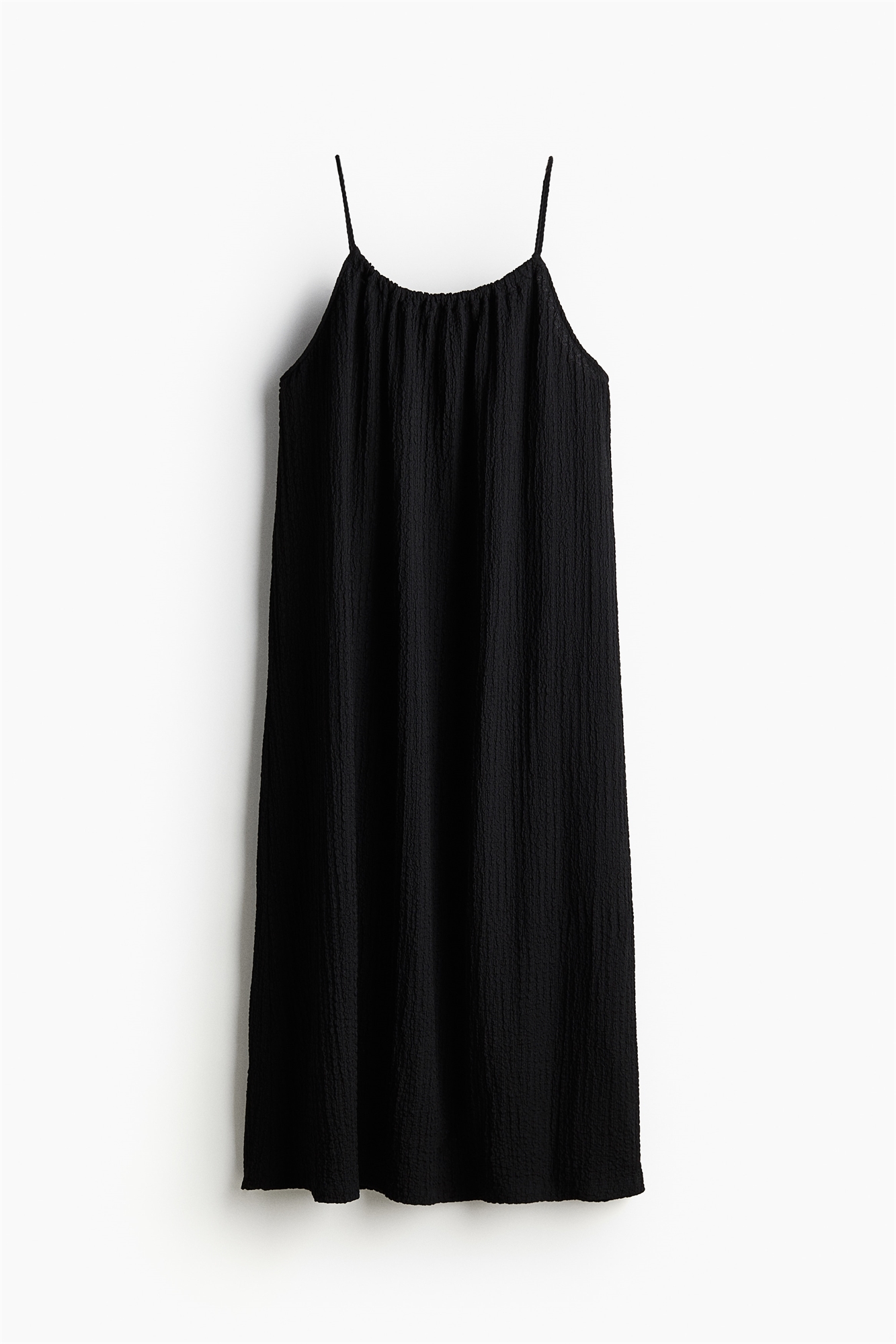 Платье свободного покроя из фактурного джерси длиной до колен, с вырезом в сборку и узкими перекрученными бретелями.