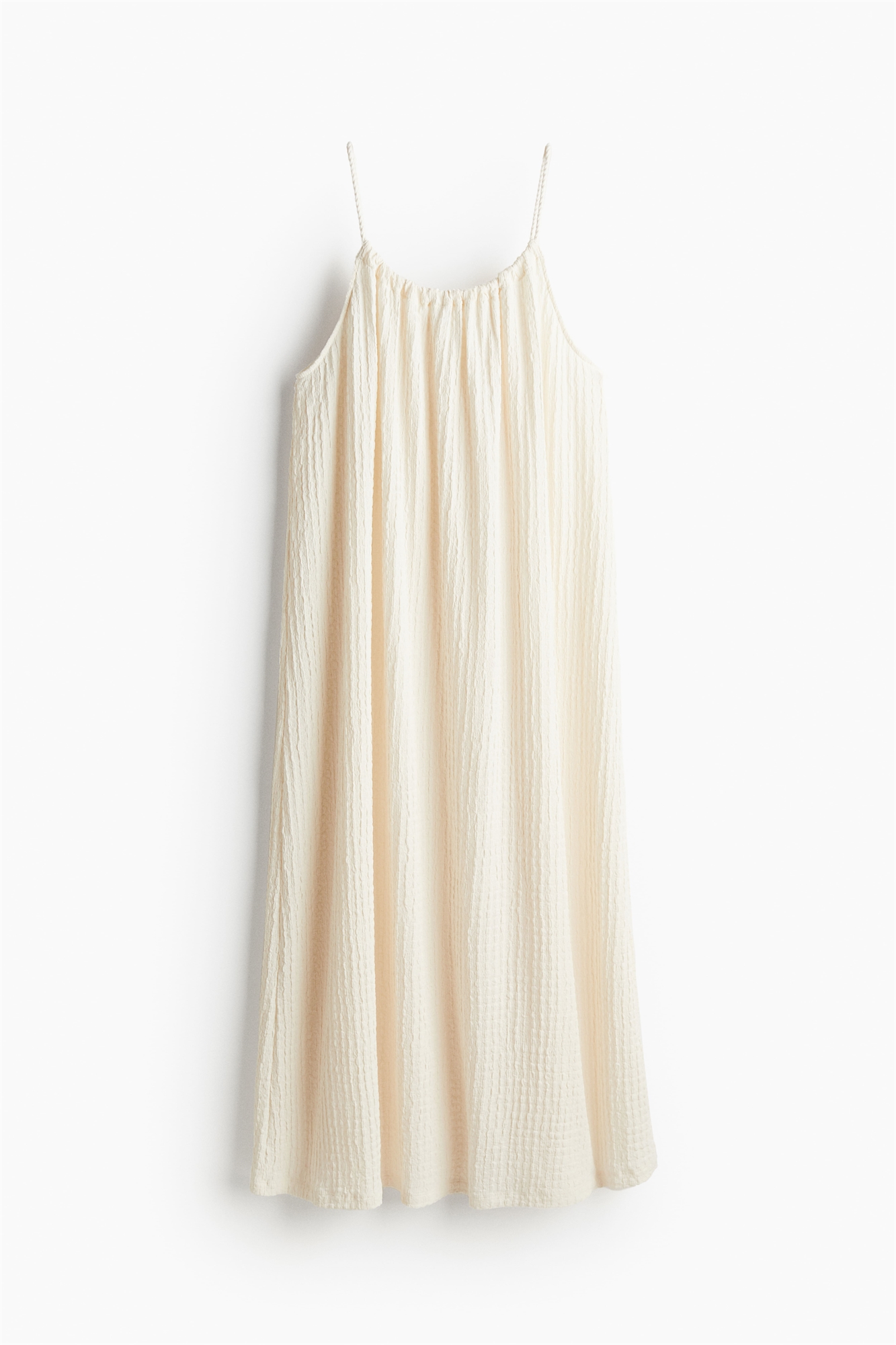 Платье свободного покроя из фактурного джерси длиной до колен, с вырезом в сборку и узкими перекрученными бретелями.