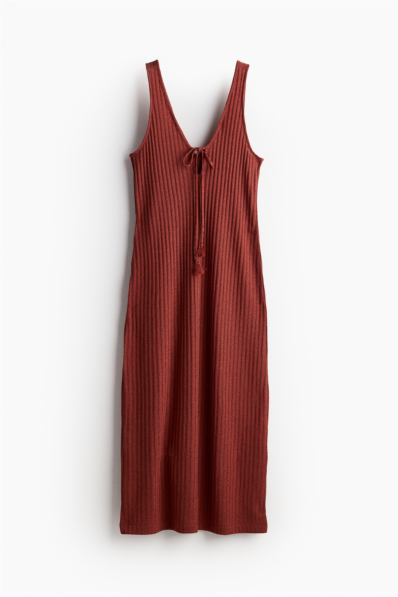 Приталенное платье длиной до колен из мягкого трикотажа в рубчик с широкими бретелями и глубоким V-образным вырезом с узкими завязками спереди.