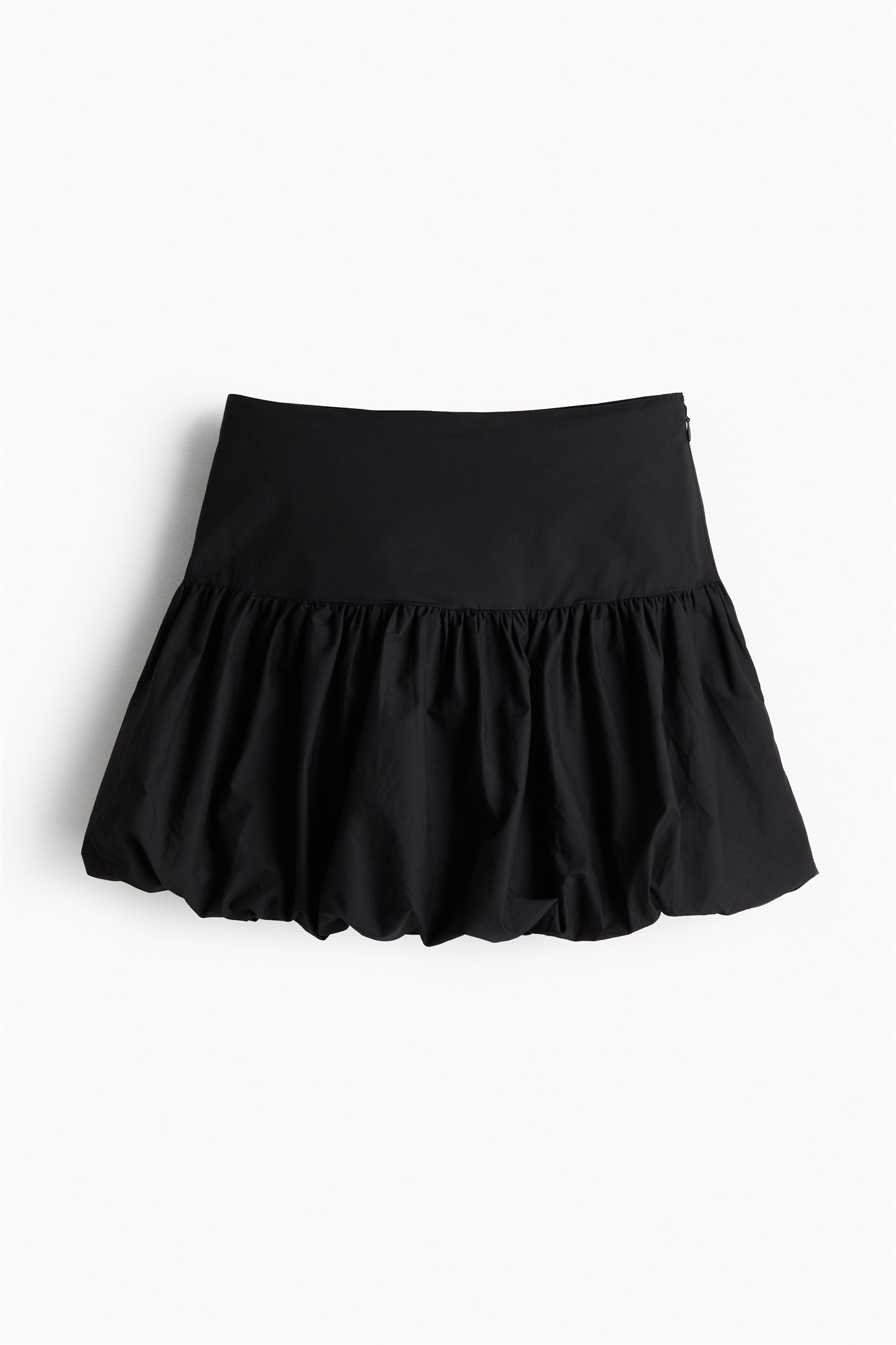 Короткая юбка из хрустящего поплина с заниженной талией и потайной застежкой на молнию и крючок. Присборенный шов на бедрах и подол в виде пузыря для придания силуэту пышности. На подкладке.