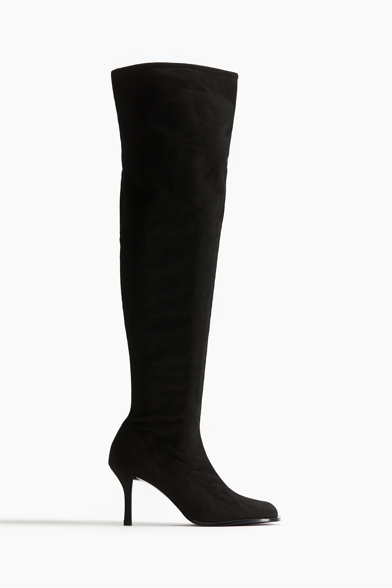 Сапоги выше колена из ворсистой ткани с облегающим голенищем и застежкой на молнию с одной стороны. Закругленные мыски и узкий каблук. Подкладка из джерси.