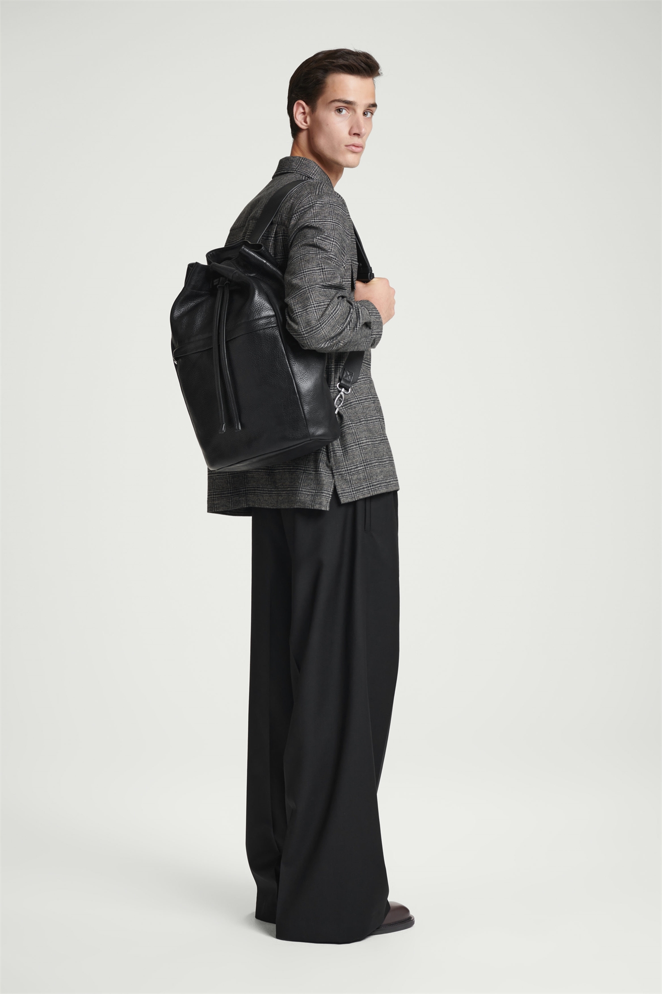 Эта сумка-дублер, выполненная из высококачественной зернистой кожи, имеет вместительное основное отделение, затягивающееся шнурком, и два кармана на молнии, в которых можно разместить предметы первой необходимости. Регулируемый ремень крепится к одному из металлических D-колец, в зависимости от того, как вы хотите ее носить. Застежка на шнурке COS поддерживает ответственное производство через Leather Working Group. Подкладка: 100% вискоза. Без учета отделки Высота: 49 см, Ширина: 30 см, Глубина: 21 см
