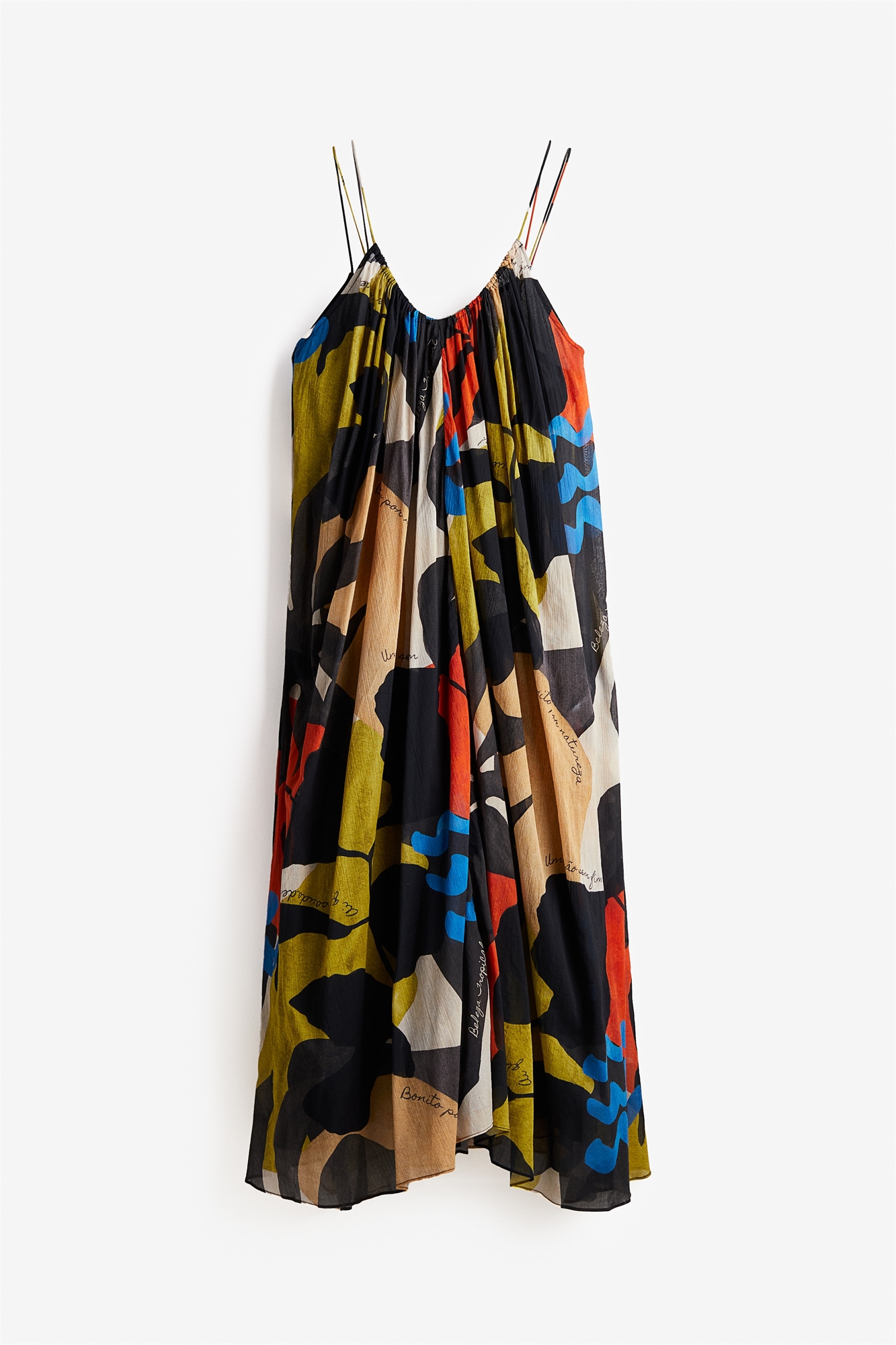 Свободное платье во всю длину из хлопкового полотна с V-образным вырезом и двойными регулируемыми бретелями-спагетти. Дизайн включает в себя воздушный А-линейный силуэт со сборками вокруг выреза и откидной спинкой. Нижнее платье из хлопкового вуаля.