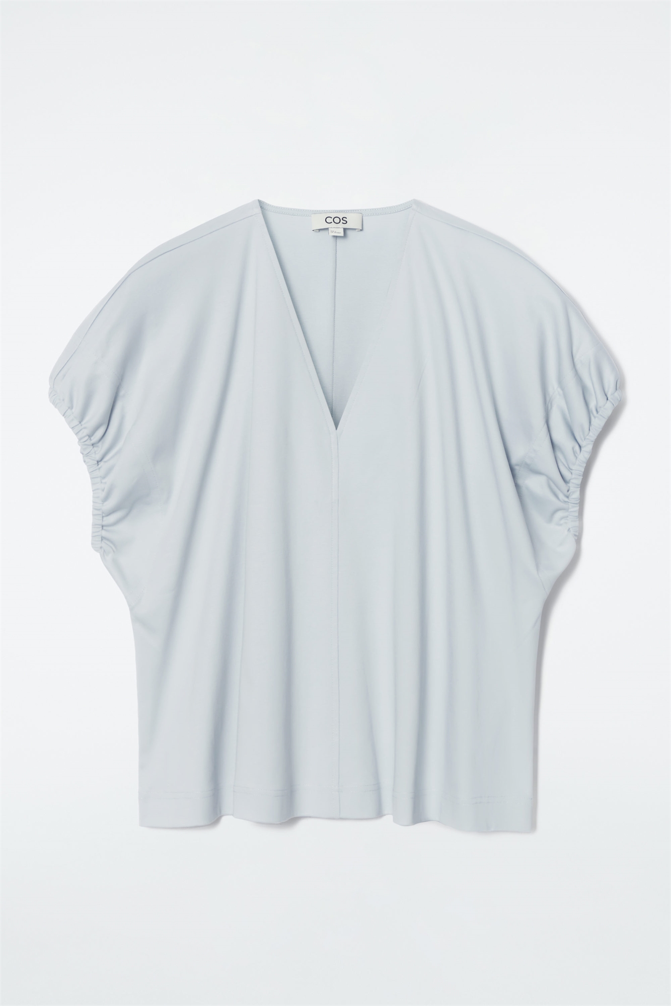 Эта блузка нежного льдисто-голубого цвета отличается женственным силуэтом и собранными, мягко драпирующимися рукавами. Подчеркните V-образный вырез, надев с ним скульптурное ожерелье. Regular fit Внешняя ткань: 100% хлопок. Детали не учитываются/Машинная стирка Длина по спинке в размере S = 60 см/Модель носит размер S