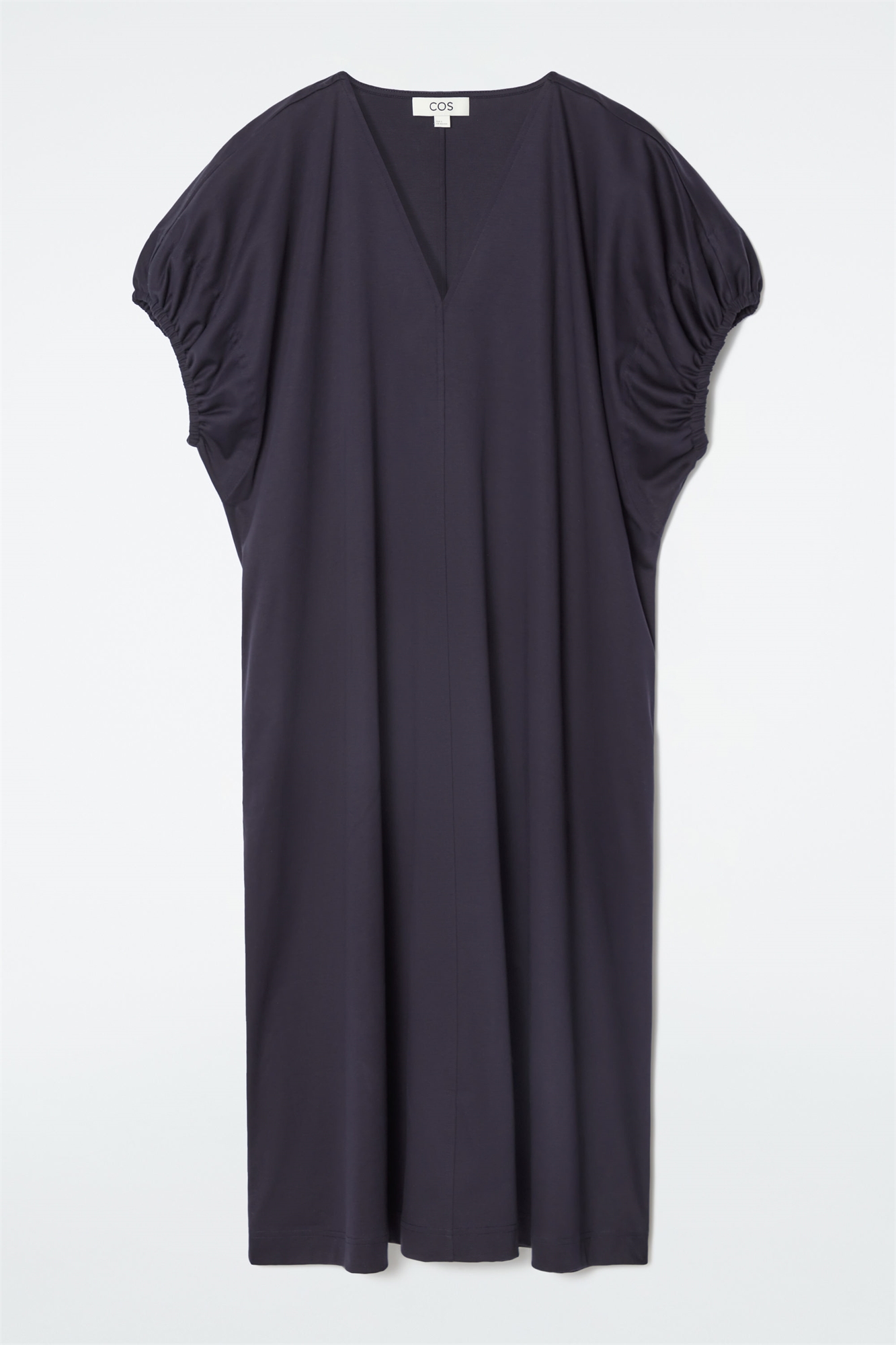 Это платье-миди приглушенного темно-синего оттенка с рукавами с рюшами, которые придают силуэту оверсайз утонченную форму. Оно сшито из хлопка-джерси для легкой драпировки и мягкости. Модель с завышенной посадкой Ткань: 100% хлопок. Без учета отделки / Машинная стирка Длина по спинке для размера S составляет 107,8 см / Модель носит размер S