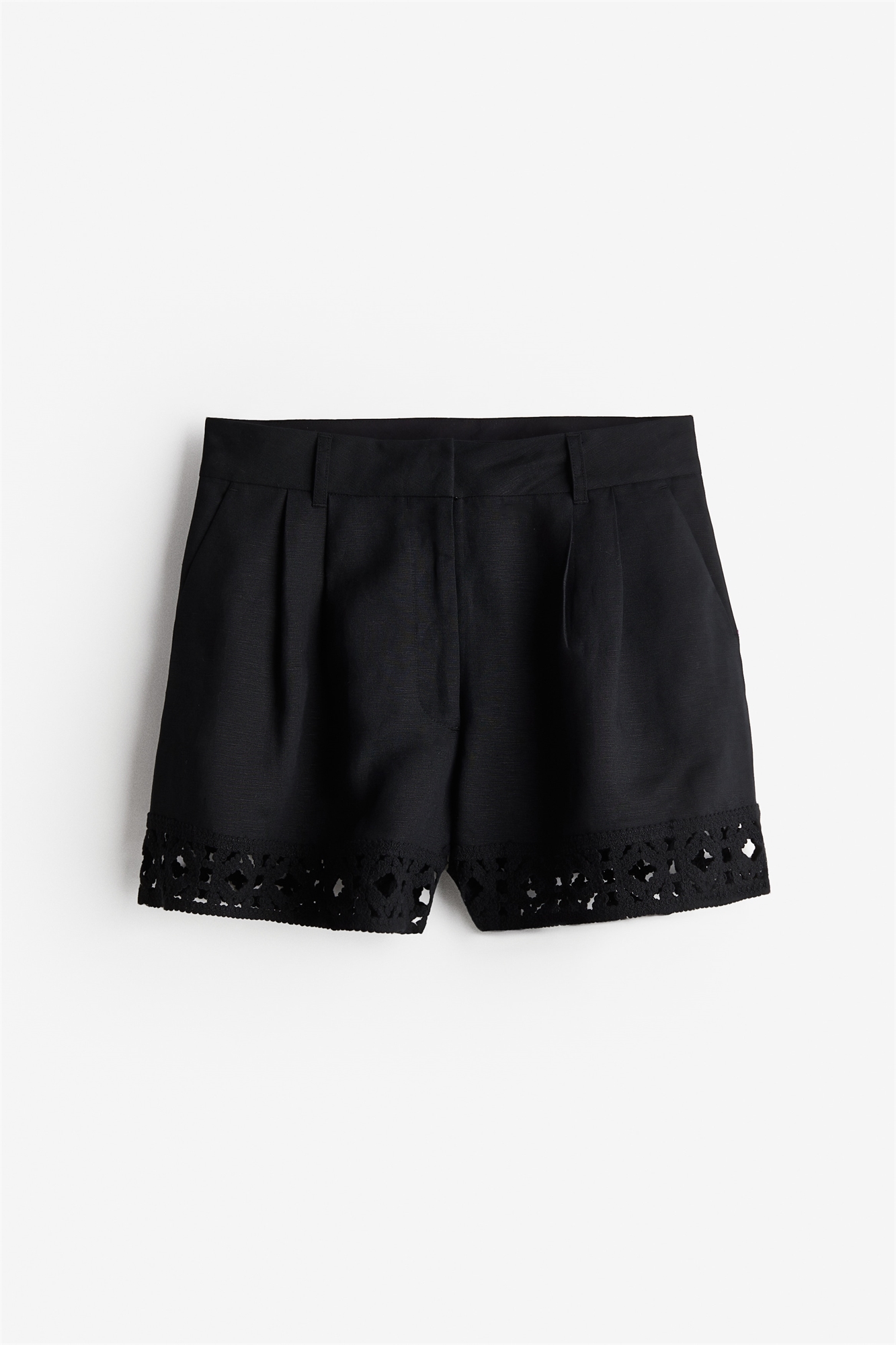 Шорты свободного покроя из льна и вискозы с высокой талией, ширинкой на молнии, скрытой застежкой на пуговицу и крючок с ушком. Небрежные боковые карманы, складки спереди и складки спереди и сзади. Широкая отделка крючком по краям.