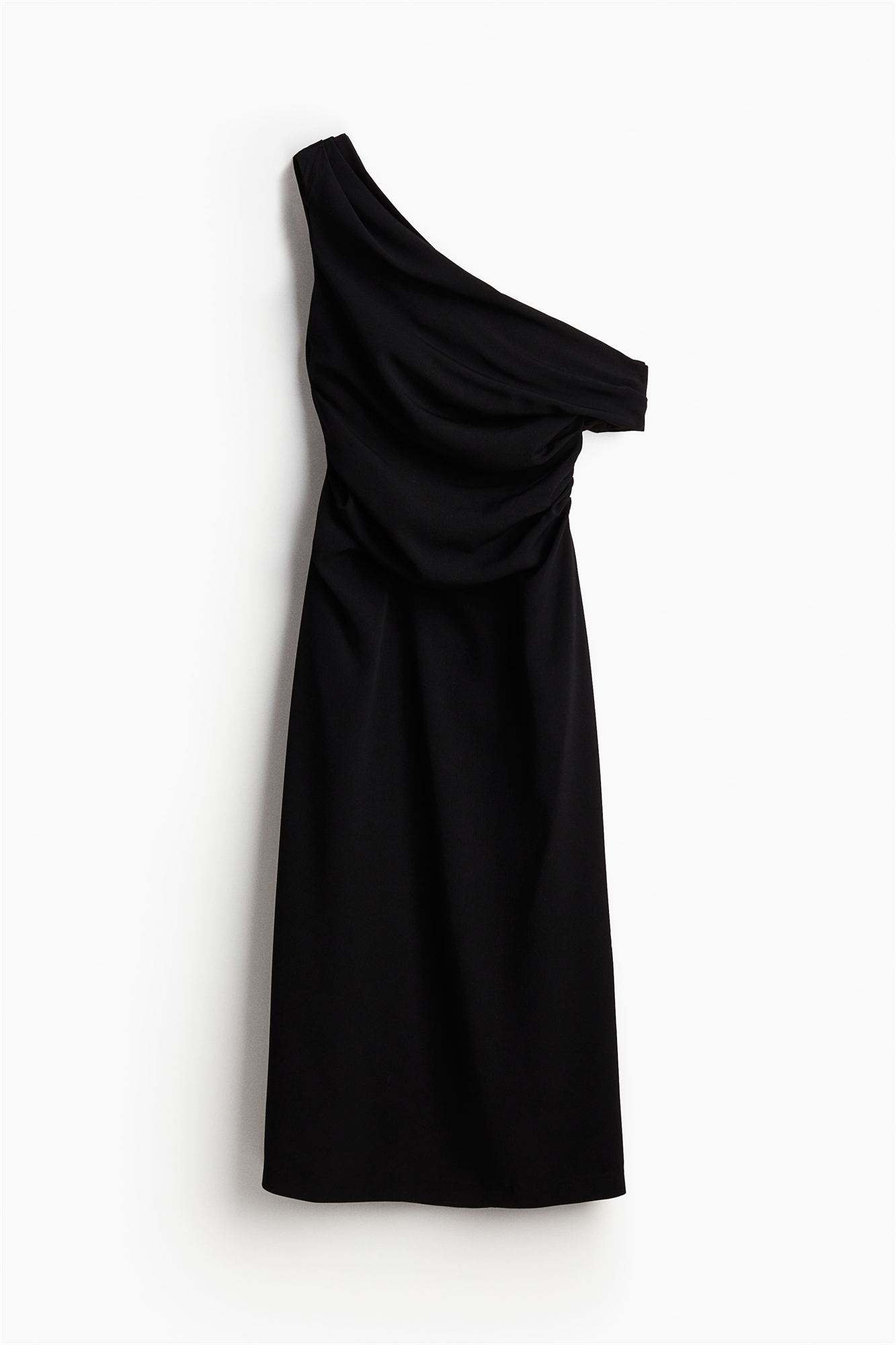Приталенное платье на одно плечо из крепа длиной до колен с бретелью на одно плечо и асимметричным вырезом с отверстием для другой руки. Потайная застежка-молния с одной стороны и складки на талии, создающие эффект легкой драпировки. Подол прямого кроя с разрезом с одной стороны. Подкладка из джерси.