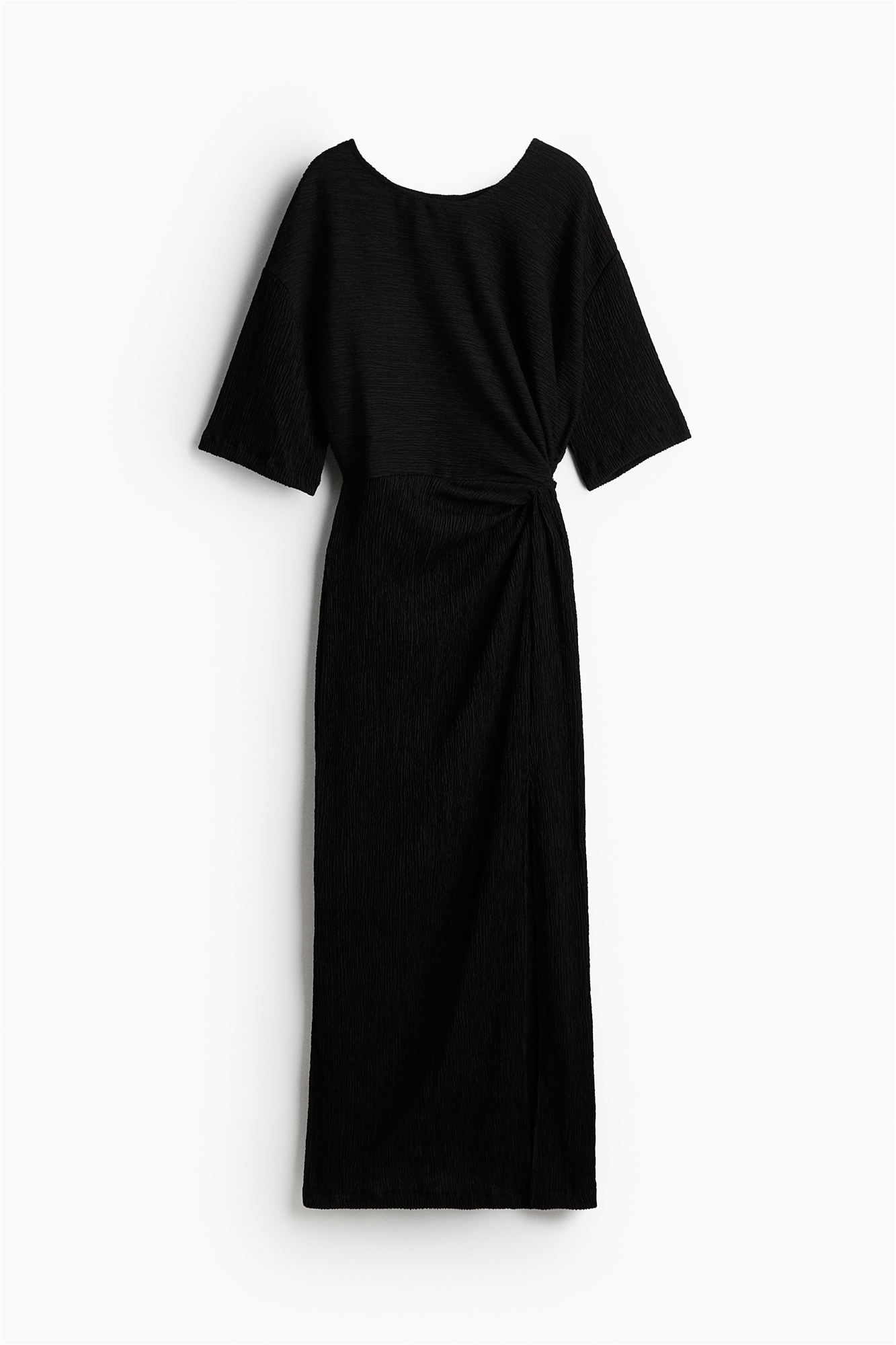 Платье макси из фактурного джерси с круглым вырезом, спущенными плечами и рукавами длиной до локтя. Свободный крой с перекрученной деталью на талии для эффекта драпировки. Высокий разрез спереди.