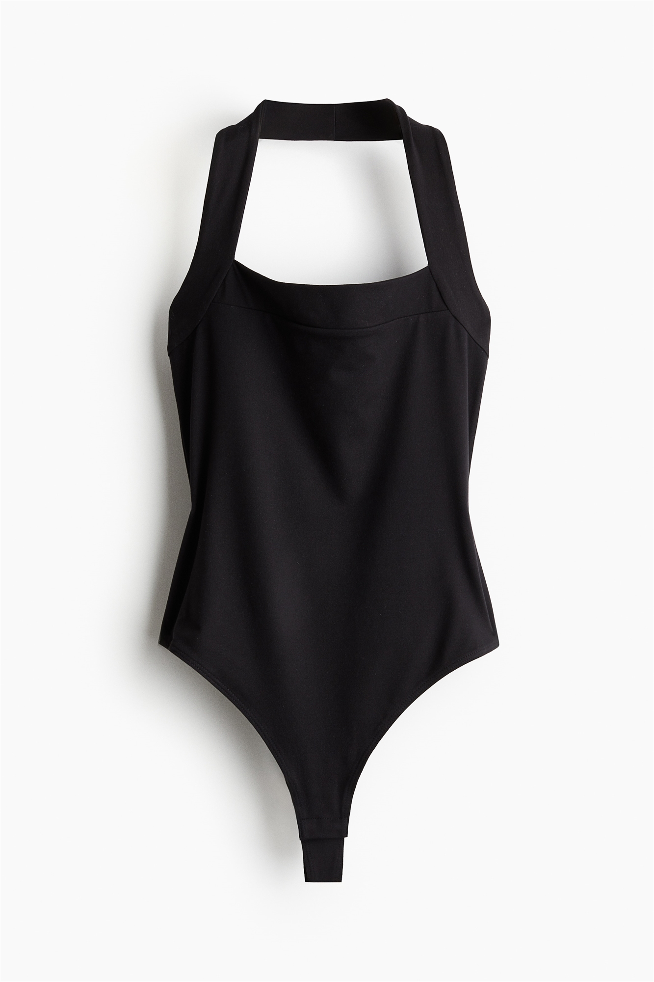 Боди стринги из эластичного джерси с широкой бретелью и прямым вырезом. Скрытые кнопки в промежности.