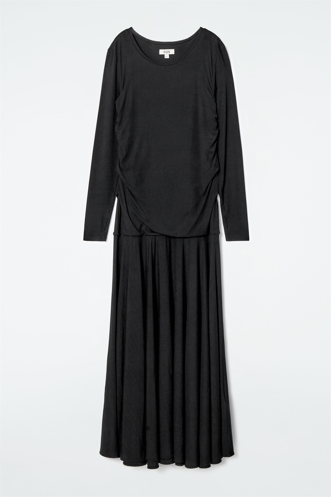 В этом сезоне дизайнеры женской одежды COS играют с пропорциями. Это платье-макси из гладкого вискозного трикотажа ECOVERO™ с рюшами создает облегающий силуэт. Вырез-лодочка обрамляет декольте, а манжеты с отверстиями для большого пальца и заниженная талия являются актуальными штрихами. Зауженный крой ECOVERO™ является торговой маркой Lenzing AG. Волокна вискозы получены из сертифицированных возобновляемых источников древесины с использованием процесса, снижающего воздействие на окружающую среду. Без учета отделки / Машинная стирка Длина по спинке для размера S составляет 131,5 см / Модель носит размер S