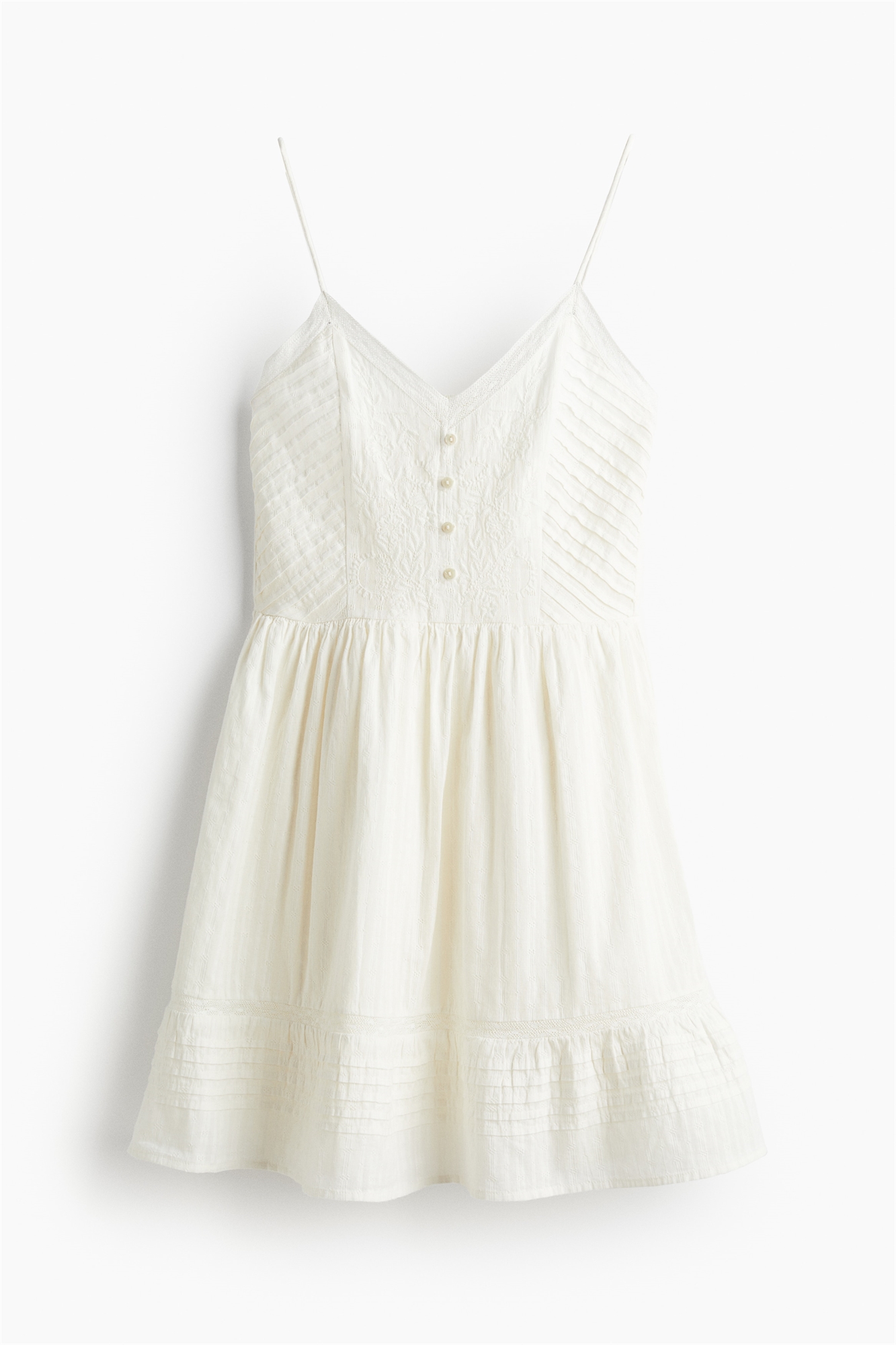 Короткое платье из хлопкового полотна с бретельками-спагетти и V-образным вырезом. Приталенный лиф с вышивкой тон в тон и перламутровыми пуговицами спереди, пинетки по бокам и платочная вставка сзади. Присборенный шов на талии и расклешенная юбка с принтами на подоле. Юбка на подкладке.