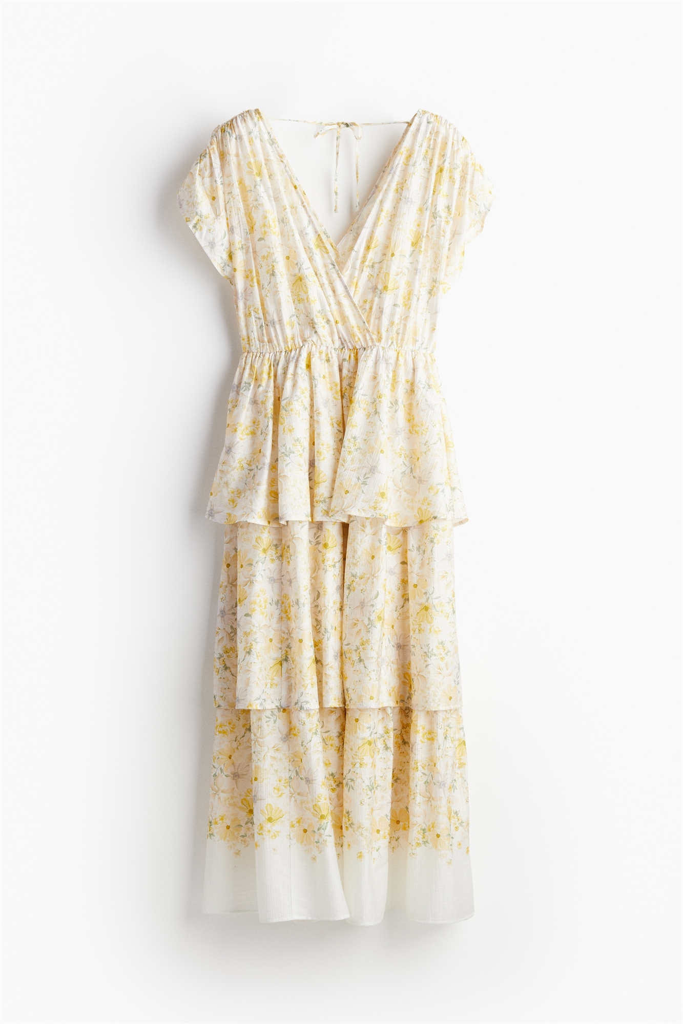Платье свободного покроя из тканого материала с V-образным вырезом горловины, облегающим верхом и узкими горизонтальными завязками сзади на шее. Короткие широкие рукава с собранными плечевыми швами, узкая резинка на талии и многоярусные воланы на юбке. Без подкладки.