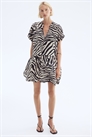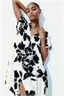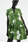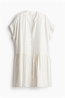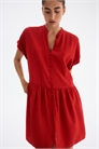 Короткое платье-туника свободного покроя с переплетением нитей, воротником-бантом и V-образной проймой спереди. Короткие рукава с отворачивающимися манжетами, пуговицы спереди и сборчатый шов на бедрах для придания объема. Без подкладки.