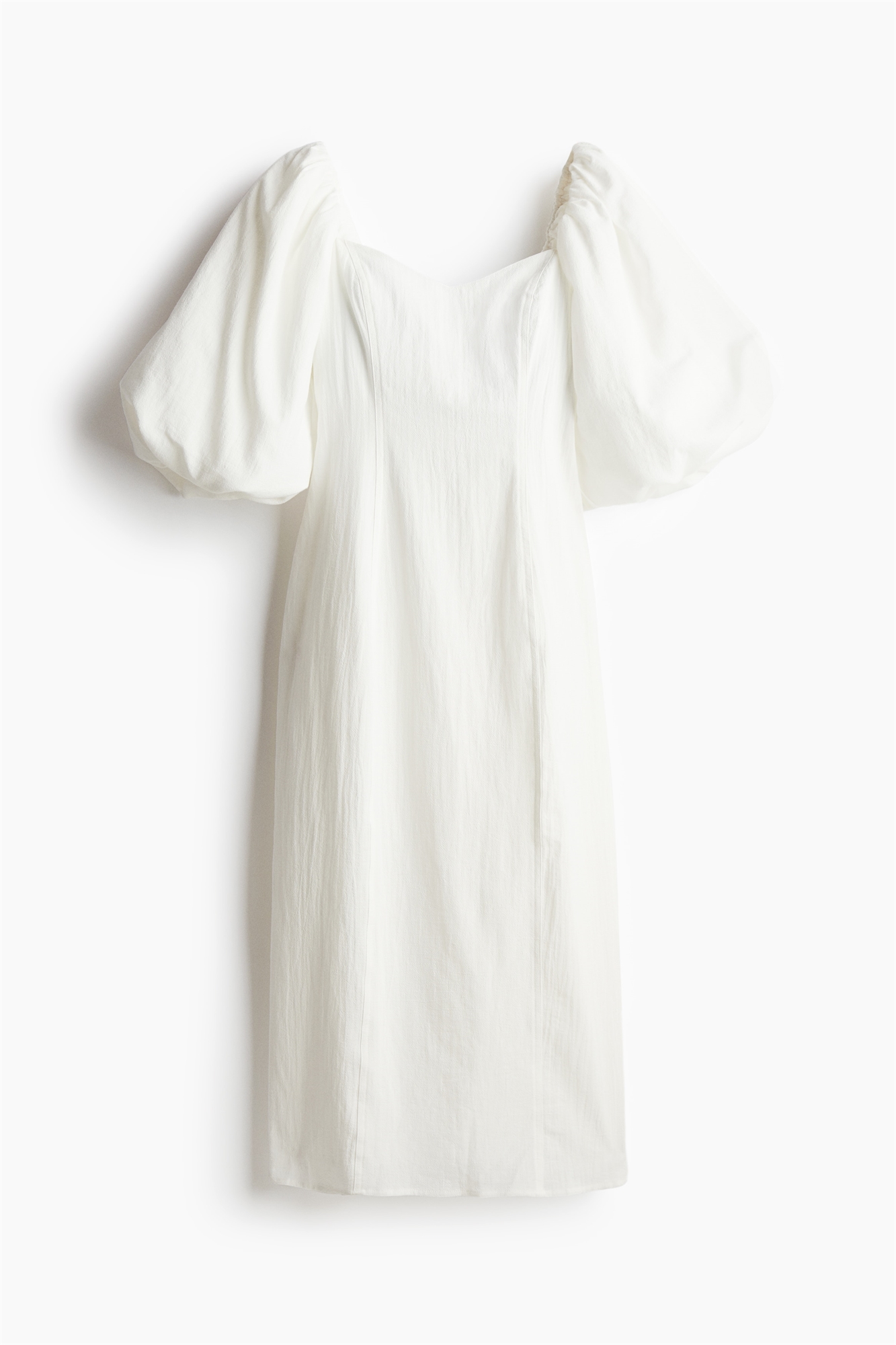 Приталенное платье длиной до колен из хлопкового крепа с вырезом в форме сердца, платочной вставкой сзади и потайной застежкой на молнию с одной стороны. Рукава-баллоны из органзы длиной до локтя с эластичной отделкой по плечам и на манжетах. Подол прямого кроя с разрезом сзади. Подкладка из хлопковой вуали.