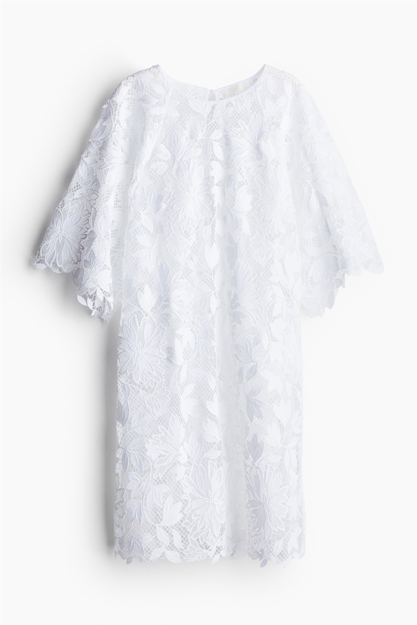 Короткое платье из кружева с круглым вырезом и рукавами реглан длиной до локтя. Глубокая пройма сзади с двумя парами узких завязок. Манжеты и подол с неровным краем, повторяющим узор кружева. Без отделки.