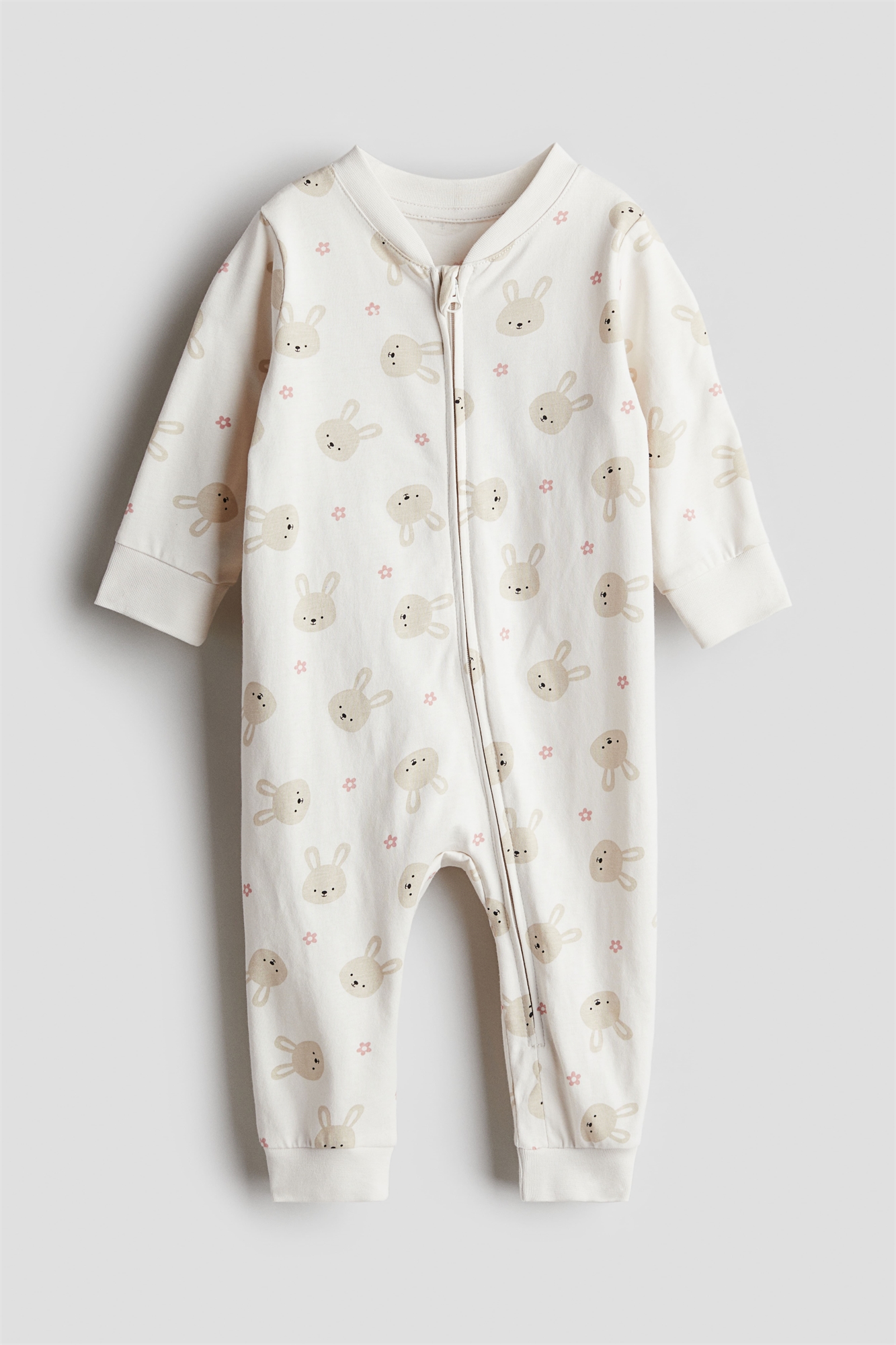 Спальный костюм из супермягкого хлопкового джерси с принтом на всю длину. Застежка-молния спереди, которая продолжается по одной ноге и имеет защиту подбородка от натирания в верхней части. Длинные рукава с манжетами и длинные ноги с ребристыми краями.