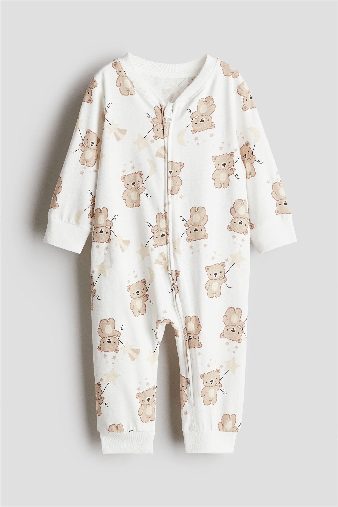 Спальный костюм из супермягкого хлопкового джерси с принтом на всю длину. Застежка-молния спереди, которая продолжается по одной ноге и имеет защиту подбородка от натирания в верхней части. Длинные рукава с манжетами и длинные ноги с ребристыми краями.