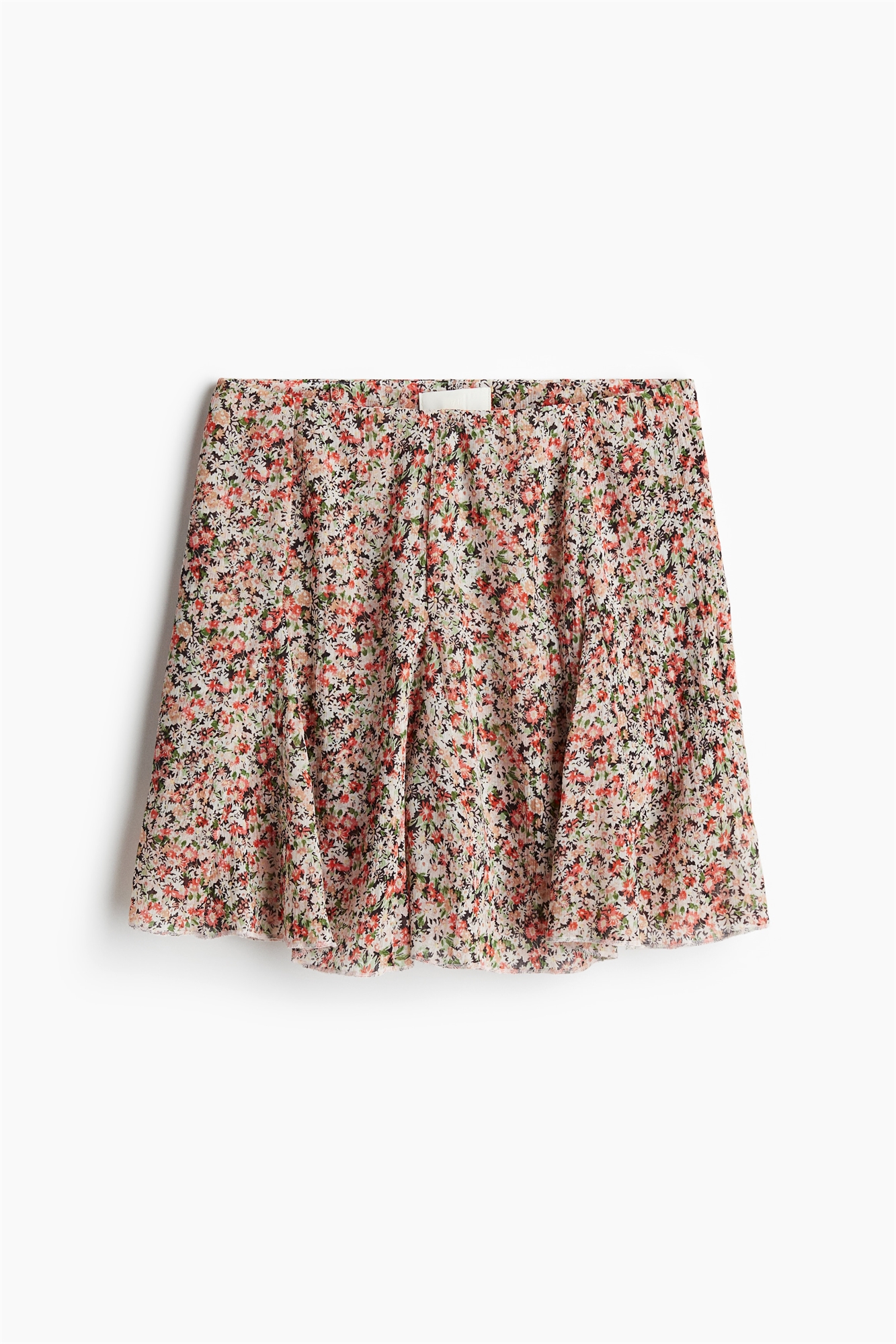 Короткая юбка из крепового полотна с высокой талией, потайной застежкой-молнией с одной стороны и вставками по подолу для создания расклешенного силуэта. Шорты на подкладке.