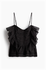 Облегающий топ из хлопкового полотна с регулируемыми бретелями-спагетти, вырезом в форме сердца и отделкой оборками спереди и сзади. Спереди отделка рюшами, сзади - платочная вставка, а по подолу - расклешенная складка с кружевными вставками в виде лесенки. На подкладке.