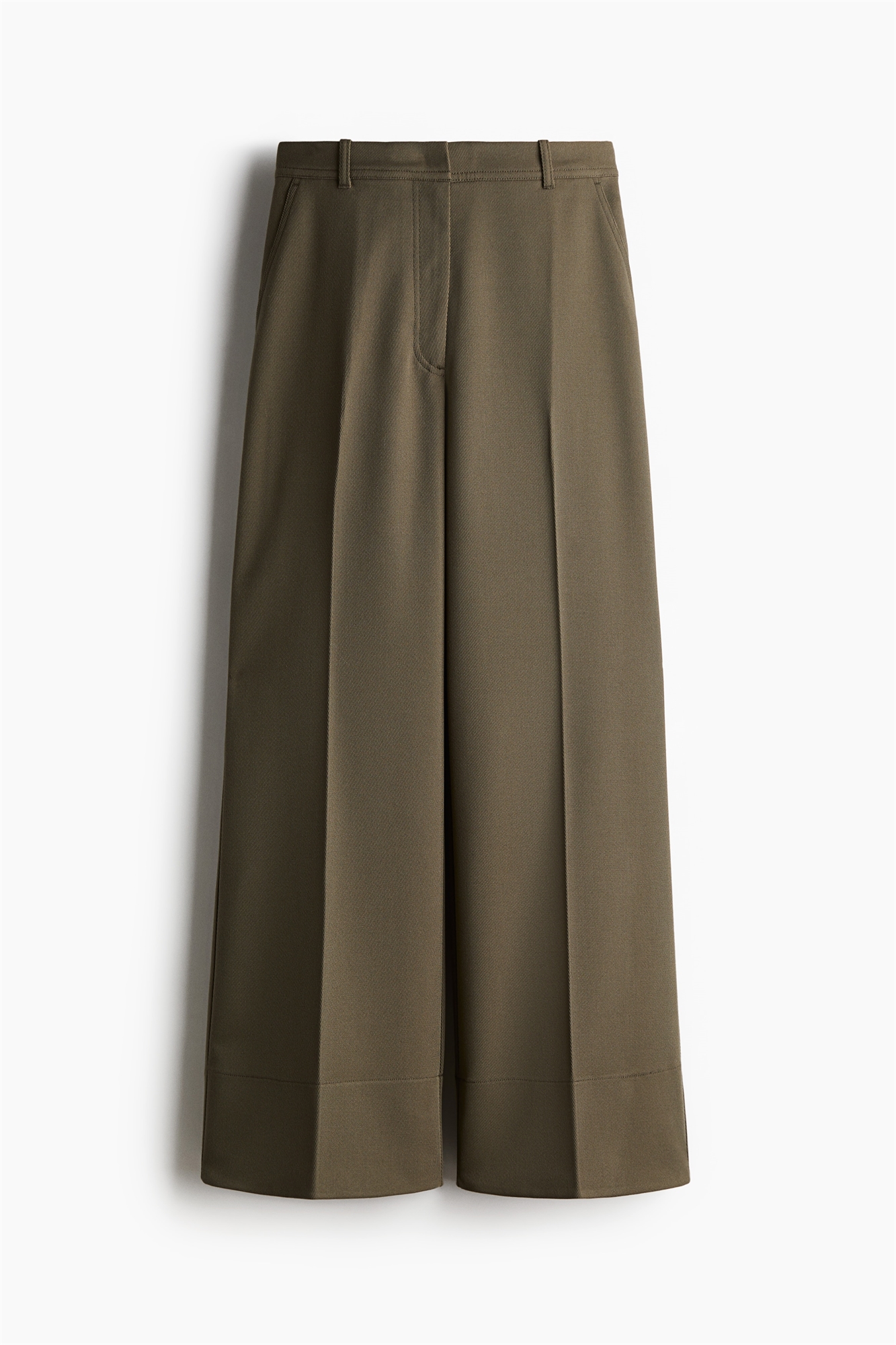 Приталенные брюки из саржи с высокой талией, ширинкой на молнии и застежкой на крючок и планку. Диагональные боковые карманы, фальшивые карманы сзади и расклешенные ноги со складками спереди и сзади.