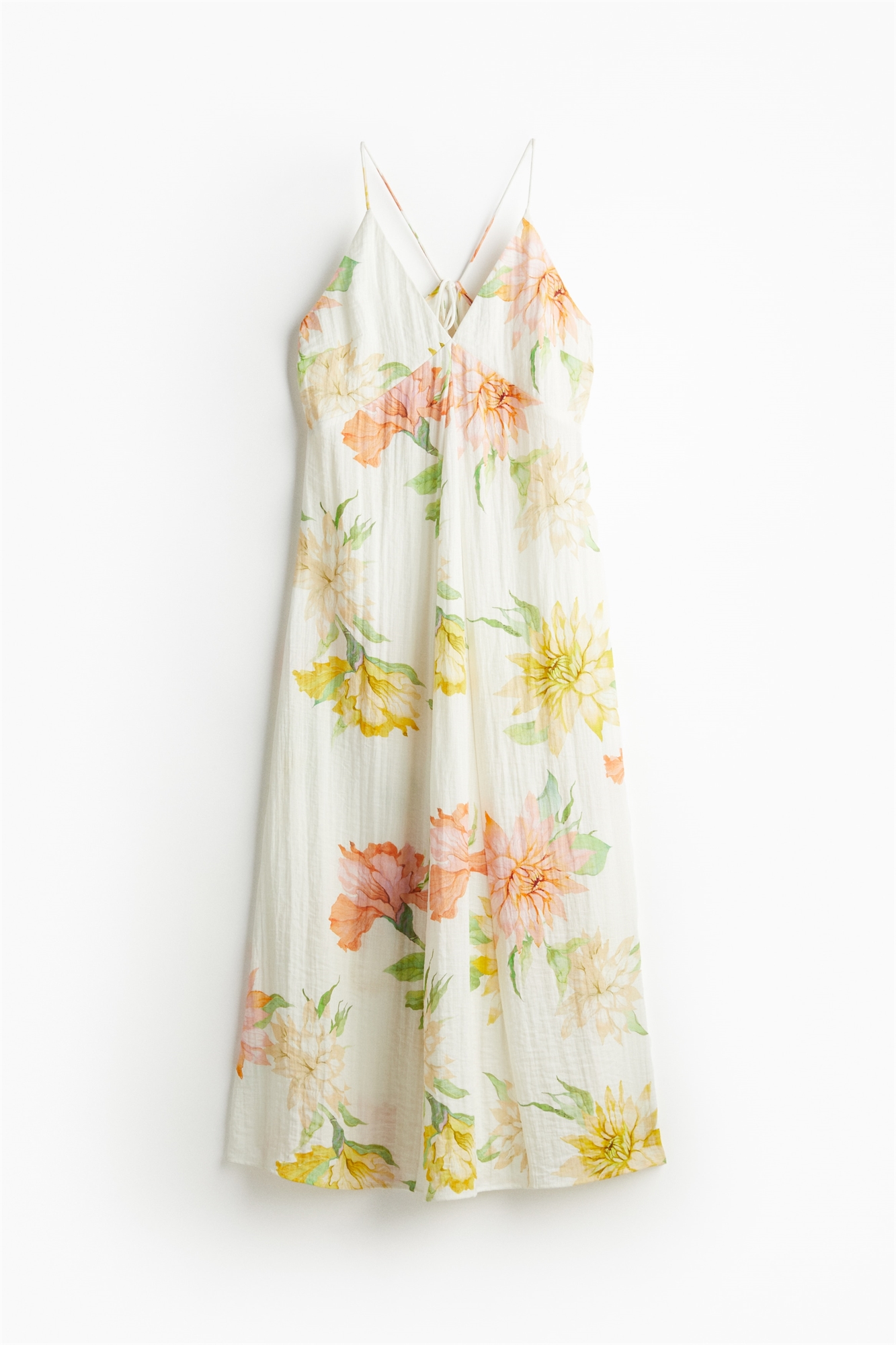 Платье длиной до колен из воздушной ткани с V-образным вырезом и бретелями-спагетти, которые продеваются через небольшие петли и завязываются сзади. Диагональные швы под бюстом и расклешенная юбка. На подкладке в области бюста.
