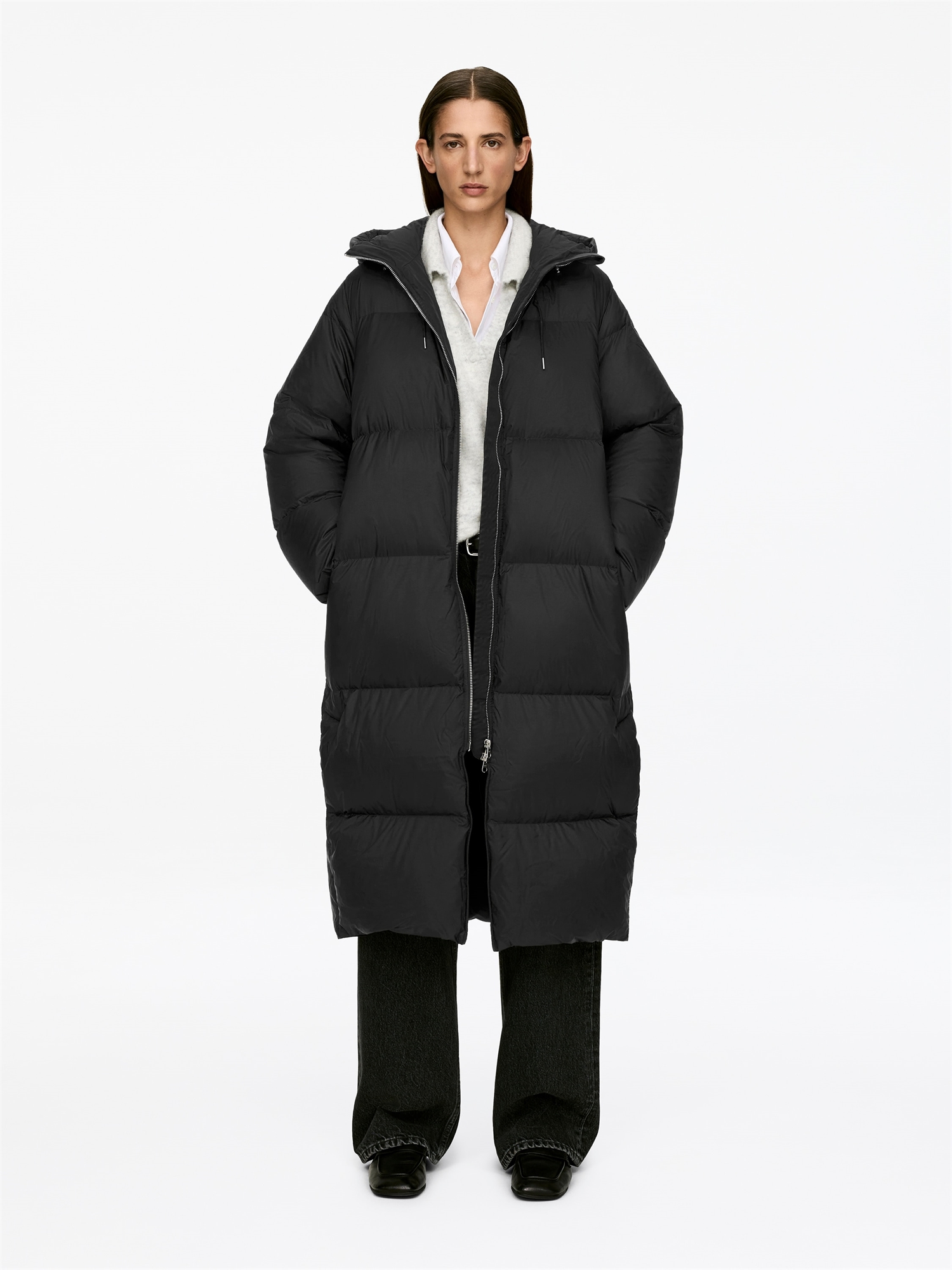 Длинное пуховое пальто с наполнителем из смеси пуха и перьев. Модель с капюшоном, застежкой на молнию спереди и скрытыми боковыми разрезами с застежками-кнопками. Боковые карманы застегиваются на молнию. Изделия Upcycled Down наполнены переработанным пухом и перьями, полученными от Re:Down®. Эти материалы, собранные из использованного текстиля, стираются и стерилизуются при высоких температурах без использования химикатов.