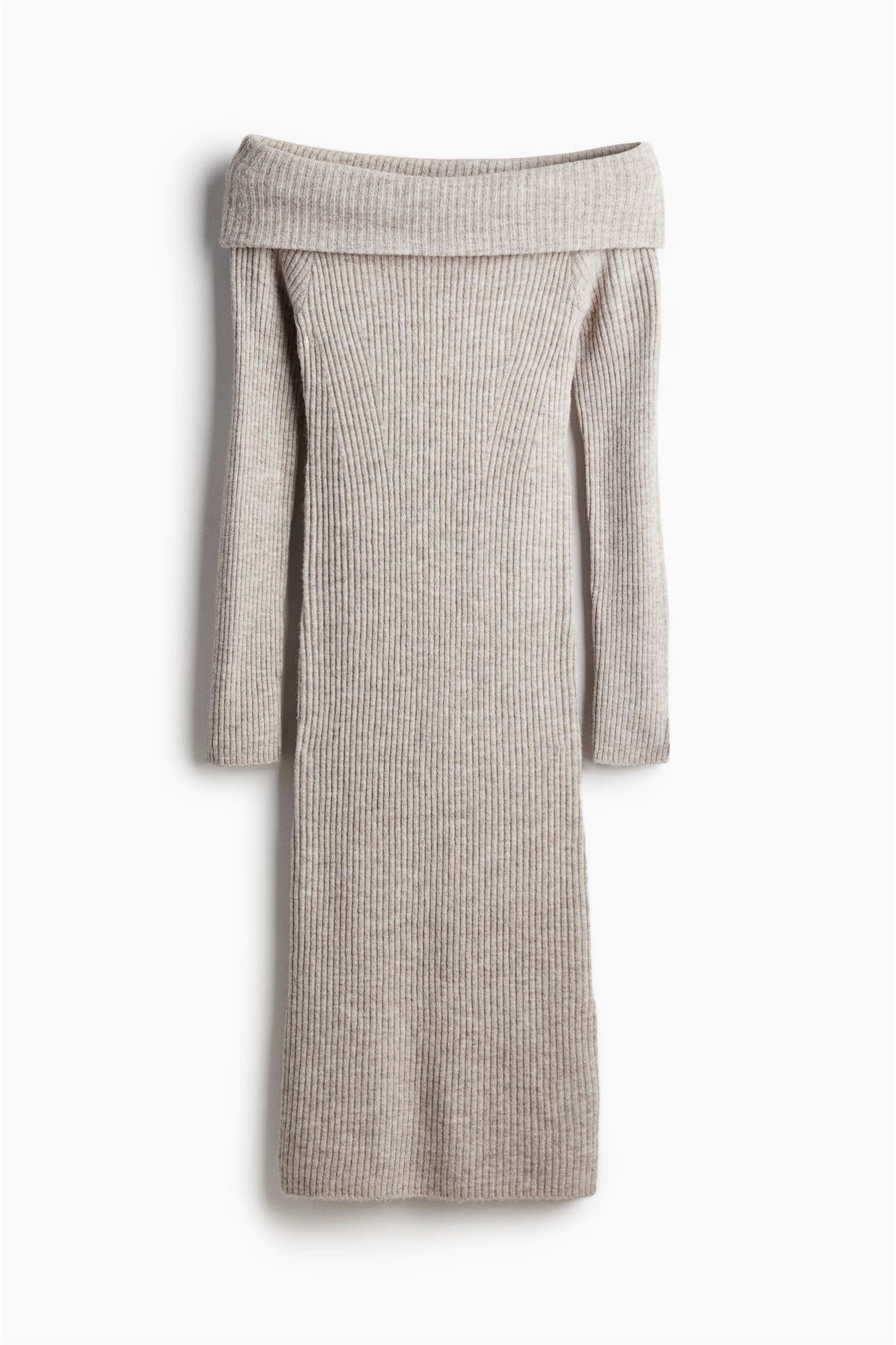 Приталенное платье длиной до колен из мягкого трикотажа в рубчик, с широкой складкой в верхней части, длинными рукавами и цельнокроеными разрезами на талии.