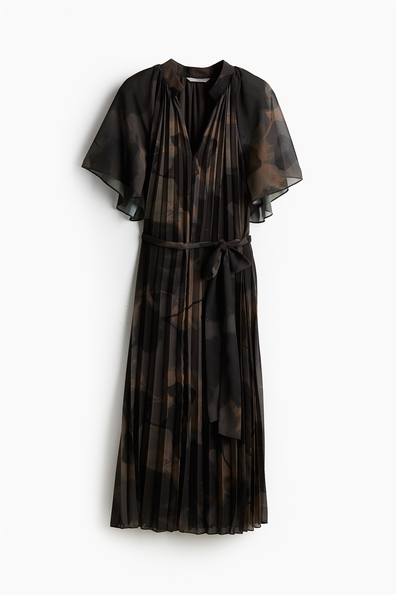Платье длиной до колена из плиссированного шифона с воротником-бантом и V-образной проймой спереди. Короткие рукава реглан и съемный пояс-завязка на талии. Частично на подкладке.