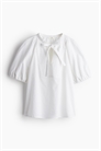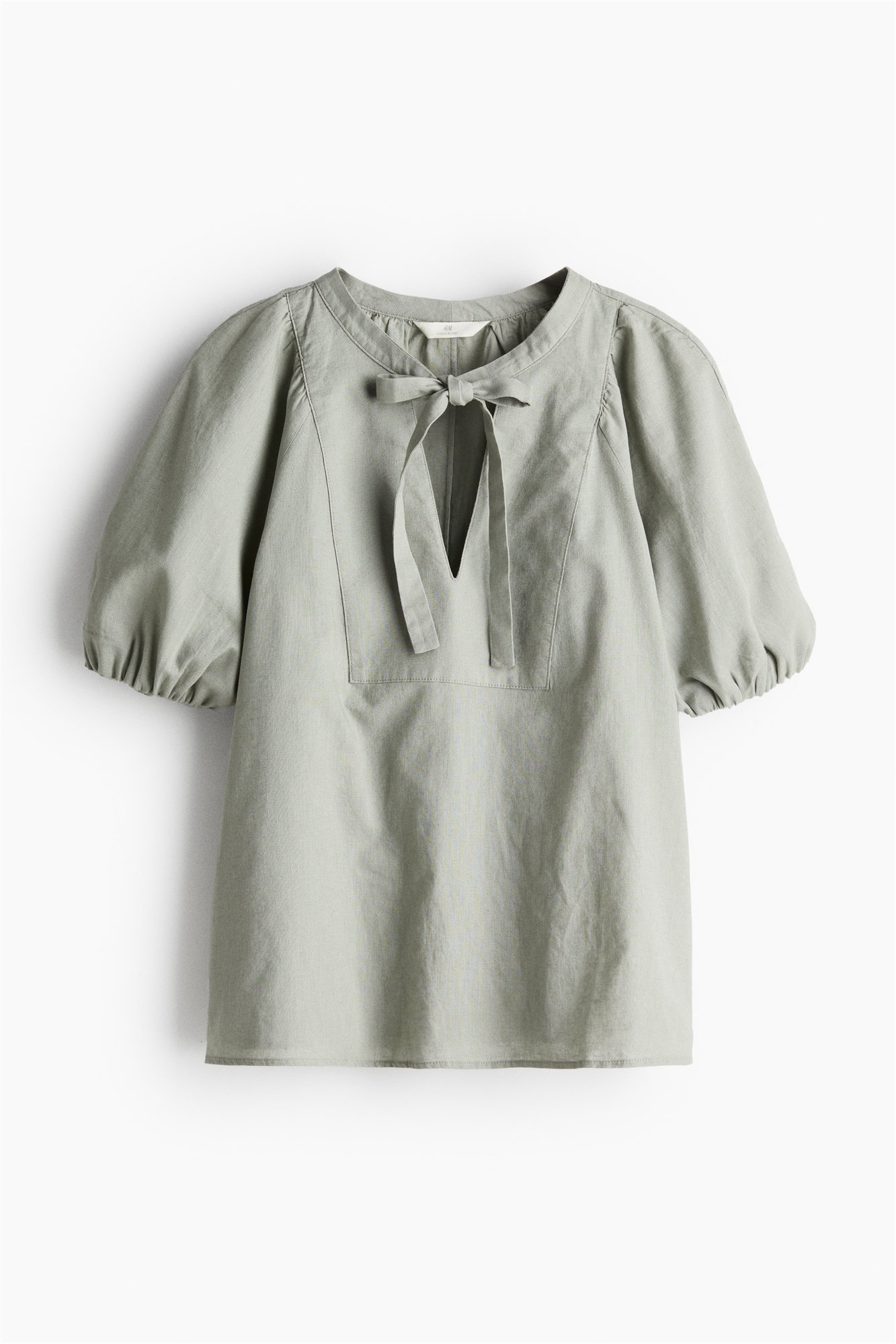 Блузка из воздушного льняного и хлопкового полотна с узкой окантовкой по вырезу горловины и V-образной проймой с завязками спереди. Короткие рукава реглан с эластичными манжетами.