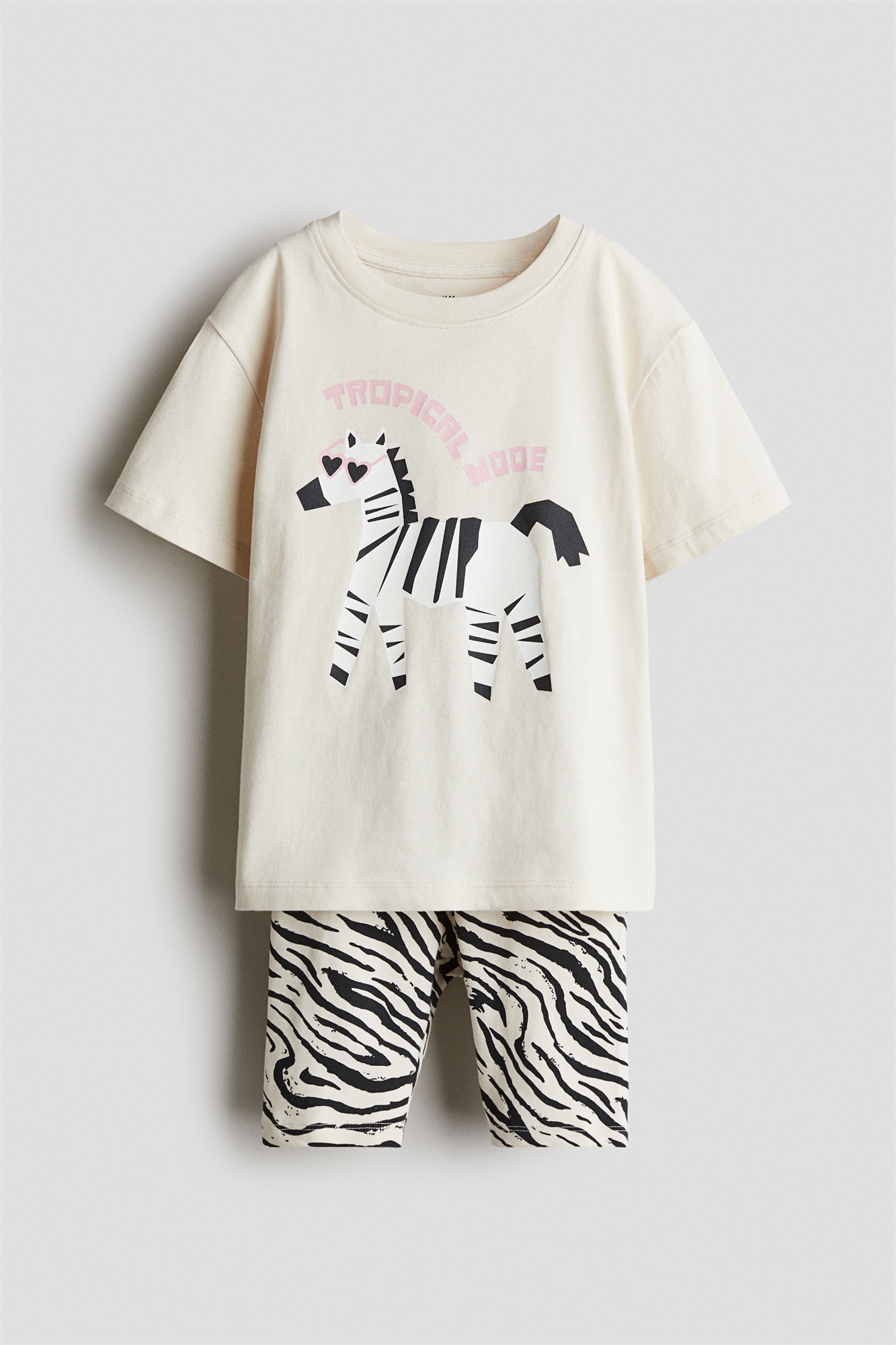 Комплект из футболки и велошорт из мягкого хлопкового джерси с принтом. Футболка свободного кроя с ребристой окантовкой по вырезу горловины и спущенными плечами. Велосипедные шорты с эластичной резинкой на талии.